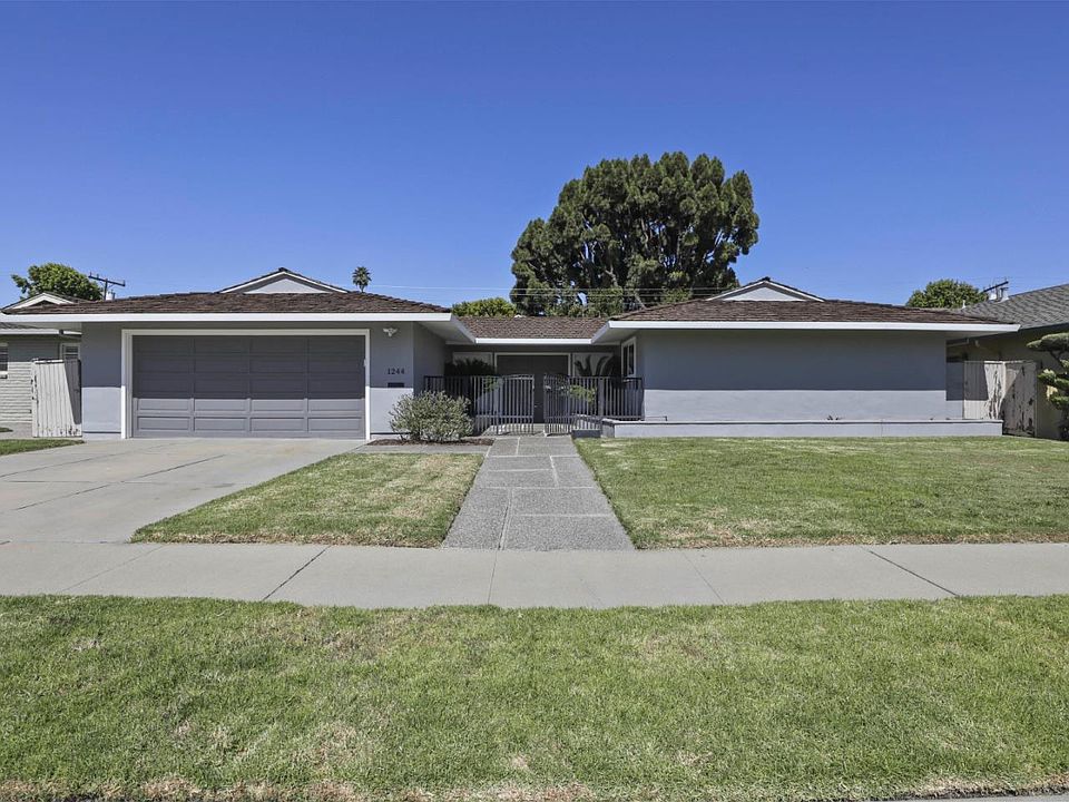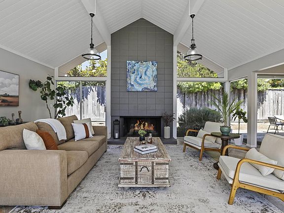 This single-level residence located in the highly desired Monterey Park of South Salinas offers a generous footprint of what awaits you. Push open the front door, and find yourself not in a living room, but in a sunny, glass-enclosed central courtyard. Surprise! Sliding glass doors give way to a character-rich main room, a brick fireplace pouring in an abundance of natural light that cuts through floor-to-ceiling glass windows to meet the top of a pitched white wood vaulted ceiling. Glass walls continue into the adjoining dining area, and the backyard views they grant seem doubled by the clever use of a mirror on the wall separating the kitchen and formal dining room. Two wings along either side of the courtyard compose the layout. Find three spacious bedrooms, a full bathroom, and a bonus living space in one wing. The current setup has the primary bedroom and en suite bathroom flowing into a private hallway connecting them to an informal drawing room with courtyard access, a wet bar, and a fireplace. Use it for entertaining, as a home office, or make it a fifth bedroom. Don't let this mid century gem get away!