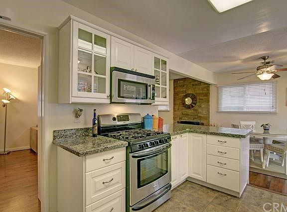 This charming home, set on an oversized corner lot has designer touches throughout. A designer paint scheme, new dual-pane windows, new baseboards, brick hearth fireplace, solar skylight, and elegant original hardwood flooring throughout compliments the spacious and eminently livable floor plan. Enjoy the remodeled kitchen with granite counter tops, upgraded stainless steel appliances, six burner gas range with convection oven, matching built-in microwave, new white cabinetry and direct backyard access. This home has a natural sense of brightness and warmth. The master suite has rich wood flooring, new baseboards, a cooling ceiling fan, a sizable built-in wardrobe with storage and an en-suite bathroom with porcelain tile frameless shower enclosure and single vanity. The secondary bedrooms have wood floors, ceiling fans and built-in closets. The convenient hall bathroom has a porcelain tile vanity and a remodeled shower/tub combo. The expansive backyard with built-in brick fireplace and grill, stamped patio and 30' RV storage area is well suited for year-round entertaining. A new roof was installed in 2010 and the attached two-car garage has electric laundry hookups and a roll up door. Well located near fwys, shopping, and South Coast Plaza.