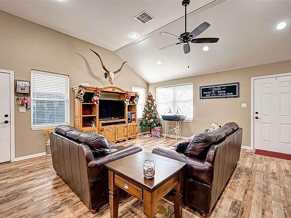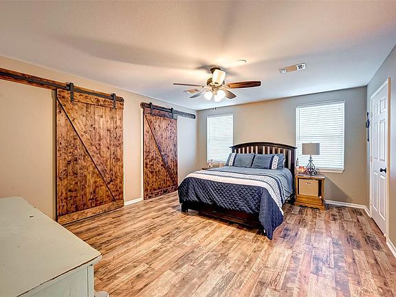 Located just minutes from the city, the charming barndominium was built in 2018 and is 1,800 sf. It features an open living room/kitchen/dining room, Primary bedroom suite with sliding barn doors, two secondary bedrooms, an additional full bath, covered carport and large front porch.