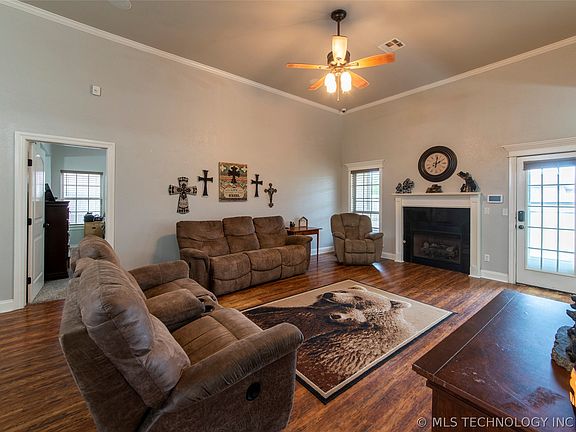 Great split plan with formal dining area, big living room, and has a BRAND NEW Roof!! Large master suite with sitting rm or office off of the bedroom. Open, tall ceilings with wired surround sound in the living area and with Brick/stone ext. Walking path to the elementary school next to the neighborhood. Has a stocked pond for fishing too! Full $2000 security system with camera's inside and out, custom made solar screens on windows, and storm shelter in garage.