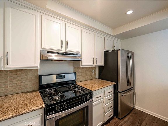 Welcome to 12446 Bay Hill Ct where comfort, convenience, and community awaits you. Les Jardins, a beautifully maintained gated complex ideal for first-time buyers. This move-in-ready 2 bed 2 bath ground-floor condo offers a warm, open-concept layout featuring updated flooring, fresh neutral paint, and a light-filled living room that flows seamlessly to a covered patio, perfect for morning coffee or relaxing evenings. The kitchen includes granite countertops, stainless steel appliances, white cabinetry, and a stylish backsplash, creating a welcoming space to cook and entertain. The spacious primary bedroom features a generous walk-in closet and a private patio space. While the upgraded bathroom offers a sleek vanity and tiled shower with glass enclosure. For added convenience, this home includes in-unit laundry with a stacked washer and dryer. The Les Jardins community provides access to resort-style amenities including two swimming pools, ponds, lush green space, and mature landscaping, all within a secure gated environment. A detached garage, one parking permit, and ample amounts of guest parking complete the package. Conveniently close to the 22, 5, and 57 freeways. With its combination of affordability, thoughtful updates, and peaceful surroundings, this condo is the perfect place to make yours!