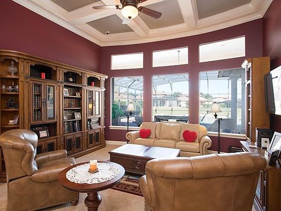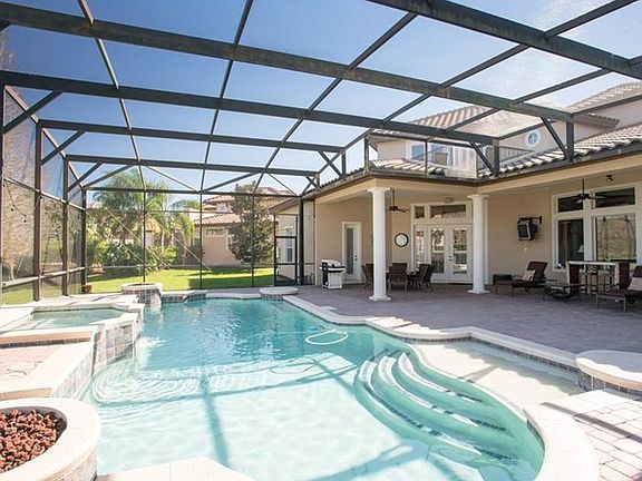 Expansive greenbelt views abound from this impressive Mediterranean executive home in gated Tuscany Ridge. Set on a beautiful lot with no rear neighbors, the "Lucca" model offers elegance, luxurious living spaces, and room for everyone with two bedrooms and an office downstairs and three bedrooms plus a bonus room upstairs. A courtyard fountain entry and double doors welcome guests and reveal a grand foyer with formal living room and adjacent dining room across from the office. Large windows overlook enormous screened lanai and pool with pavers. Chlorine pool is salt water-ready and is equipped with "intelitouch' remote controlled fiber optic light and fountain systems. Master retreat features elegant bamboo wood flooring, French doors to patio, in-room sitting area, large walk-in closet, double vanities, spectacular walk-in shower, and jetted tub. Gourmet kitchen includes 5-burner gas stove top, sink with island and breakfast bar, double oven, warming drawer, granite counters, walk-in pantry, butler pantry with wine chiller. Family room features a gas fireplace inside a built-in entertainment center. First-floor guest bedroom and adjacent pool bath with shower. Upstairs is a generous bonus room and balcony and three bedrooms plus homework station. Three-car garage. Plus most sought-after schools: Thornebrooke Elementary, Gotha Middle, and Olympia HS.