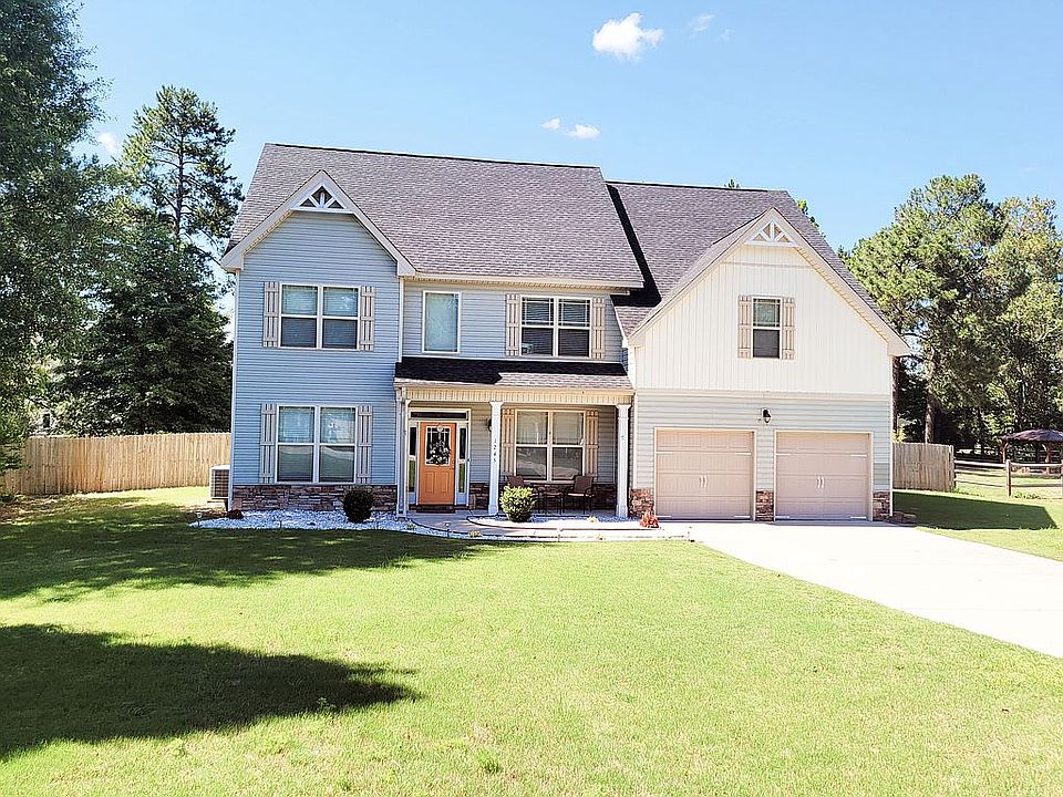 Live the life you deserve in Carolina Lakes! This beautiful home sits on a .47 acre Lot in a Gated Golf Community of Carolina Lakes! Offering a 4 bedroom with 3 full baths and Bonus Loft! 1 bedroom downstairs. Office and Formal dining room! Large Great room with two story accent stone fireplace that reaches to the top of the cathedral ceiling! Spacious kitchen with Island, lots of counter tops, oversees great room, perfect for entertaining! Scraped Hardwood.. new carpet with memory foam padding! Pergola covering back patio with built in seating! Two year old asphalt shingled 30 year roof! Shed! Large privacy fenced in backyard! Full front and back rainbird sprinkler system! Community pool, playgrounds, tennis and basketball courts, baseball fields, nature trails!! Main lake is called The Beach allowing motorized boats and jet skis! OH MY!! Place this home on your MUST SEE list! Owner will allow a paint allowance of Buyers choice with reasonable offer, 20 mins from Ft. Bragg, qualifies USDA! No City Taxes! AGENT PROTECTED!