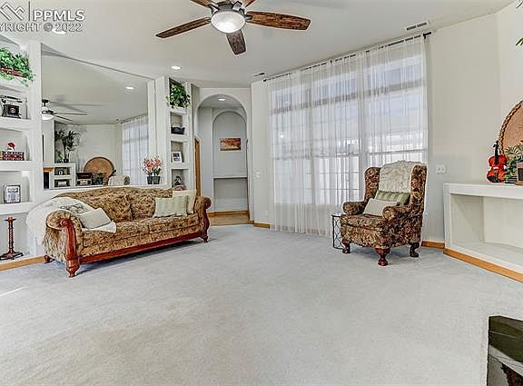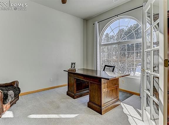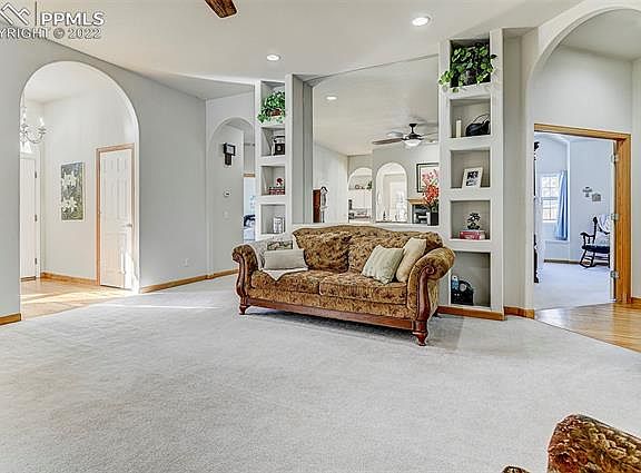 Wonderful custom ranch style home in the heart of Woodmoor on almost an acre. Arched foyer with hardwood floors leading into the spacious living room with gas fireplace that includes a marble surround, a built-in entertainment center, a wet bar with cabinets and arches that lead into the gourmet kitchen. French doors open into the office that has a large picture window for plenty of natural lighting. The gourmet kitchen features all appliances, hardwood floors, recessed lighting, a spacious dining area with bay window and includes plantation shutters. The laundry room features a sink, built-in cabinets plus the washer and dryer. The spacious family room is off the kitchen and features a gas fireplace with custom wood mantel, a spacious wet bar plus a walk-out to the bonus room. The primary bedroom features a window seat, an attached 5 piece bath with L-shaped vanity, a jetted tub and his and hers separate closets. Two additional bedrooms, a bath with stall shower, a full size bath and a heated bonus/fitness room with pellet stove, wood beam ceiling, a skylights, a ceiling fan and walk-out to the deck. Oversized finished 3-car attached garage with workshop and epoxy flooring. Great location near the Country Club at Woodmoor, Toboggan Hill for sledding and open space. Woodmoor offers 24/7 security, open spaces, ponds and community Barn. A must see!