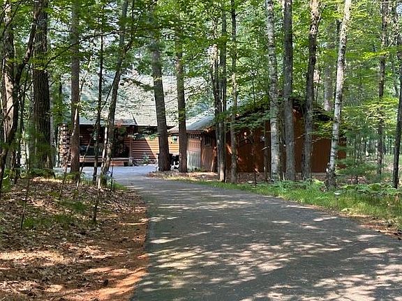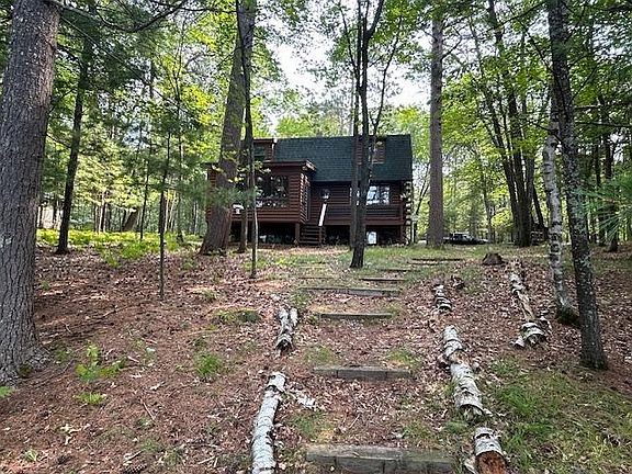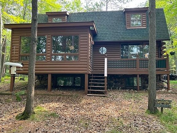A rustic retreat is waiting for you. The blacktop driveway entry to the cabin is tree lined and located near shopping and medical facilities. Situated on a water front lot the view is breath taking. The lake is 14 acres of crystal clear water with all sand bottom and a depth of 32 ft. The home features log siding with a deck over looking the lake. Interior features include knotty pine and carpeted flooring, beamed ceilings and a corner gas fireplace. A 3 season lakeside sunroom offers an incredible view of the lake and includes vaulted ceiling, skylight and knotty pine interior finish and baseboard heat. There is a half bath on the main level as well. Lower level has an extra sleeping (non conforming) area and open office or reading room area and lots of storage space. The garage is dream come true. Extra large 32' wide x 24' deep with a furnace, work benches and lots of storage space.