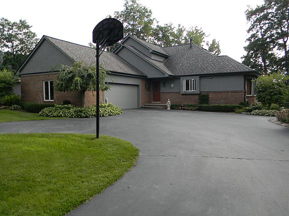 Awesome custom built home on spectacular resort like setting with amazing lake views. Long circular drive leads to lush landscaping w/incredible gardens, sandy beach, composite decking, brick paver patio & pathways, boat dock & so much more! Fabulous open floor plan, gourmet Kitchen w/top of the line built-in SS appliances, huge granite island-ideal for entertaining! Finished walk out basement w/full kitchen, fantastic oversized 2.5 car garage,lots of parking & privacy! Well maintained!