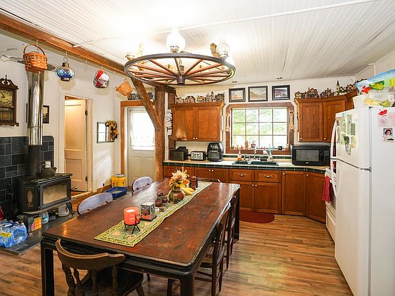 Charming Vermont Farmhouse with large 3 bay garage, formerly used as an auto repair shop. This home has had many upgrades done including electric and plumbing. You are sure to fall in love with the massive European IGA coal stove located in the kitchen and the huge Hearthstone stove in the living room. There will be room for all with 4 spacious bedrooms including a 1st floor primary. The upstairs has been updated with sheet rock and new wiring. There is lots of storage in an upstairs unfinished area just off the kitchen. Light streams into the upstairs through skylights. Located just a couple of miles from beautiful Lake Eden that features a public beach and boat access. Close to ATV trails. The sale includes 2 large mechanic car lifts and air compressor. Don't miss out on this gem!