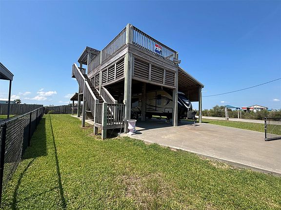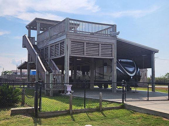 nked fence. Each separate lot is equipped with full RV hook ups, including water, sewer and electric (30 & 50 Amp). Both lots provide a 24’ x 80’ concrete driveway. Adjacent the Cabana, is a covered 24’ x 36’ RV spot in addition to an outdoor kitchen area with hot and cold water and plenty of shade. The cabana offers second story partially shaded views. An 8’ x 12’ storage building with loft provides room for fishing gear, beach toys, or tools and the outdoor shower with hot and cold water adds convenience after a day on the water. This location is perfect for boating, fishing, or enjoying all that Crystal Beach has to offer.