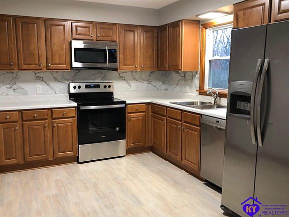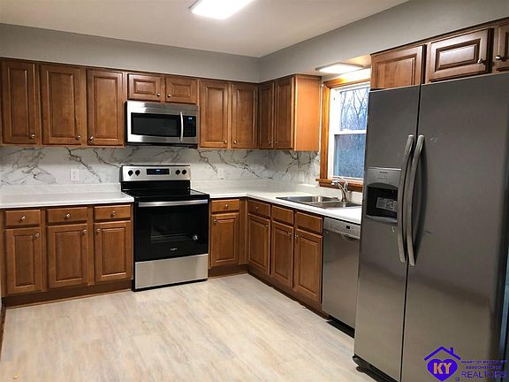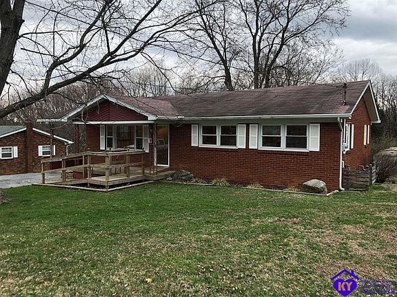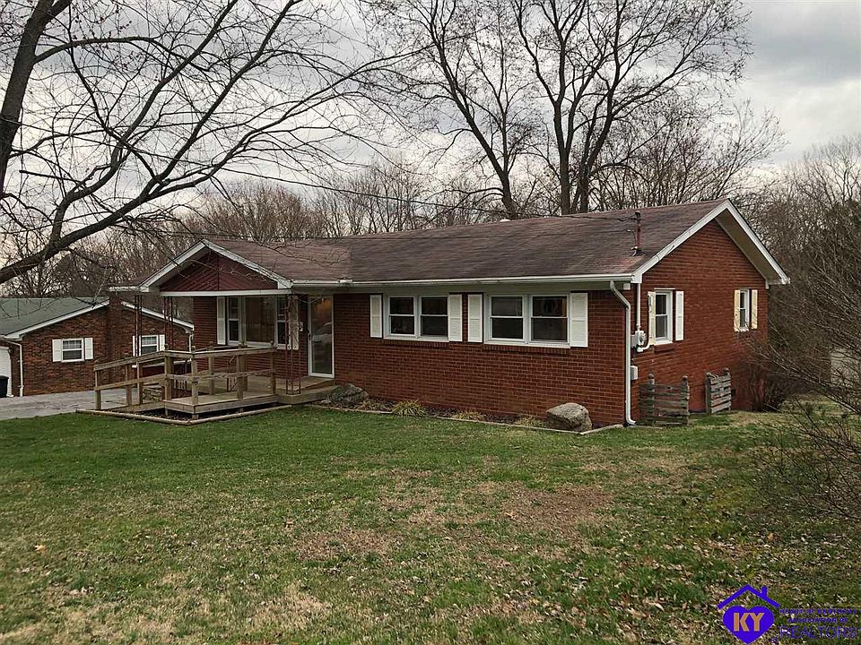 All brick home in the heart of Brandenburg! New cabinets and countertops, new stainless steel finish appliances, all new lighting and ceiling fans, and freshly painted throughout the home. Hardwood floors in living room, hallway, and bedrooms (dark spots don't appear to be weak spots). The home has a handicap accessible ramp (can be removed if desired). Paved driveway. The carport extends the the back deck that leads to the covered back porch and nice back yard. 3 small storage buildings in the backyard.