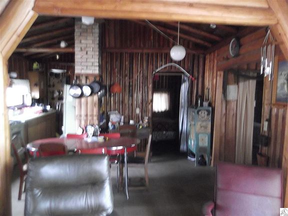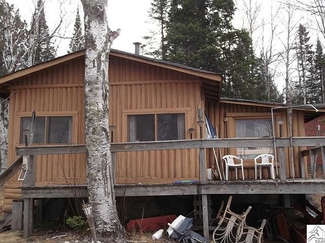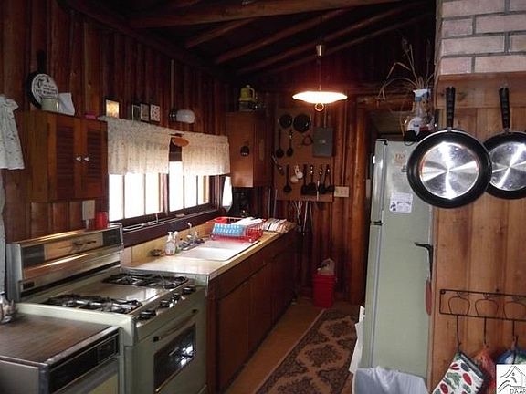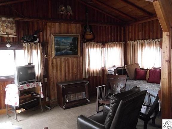 This 2 bedroom cabin is of vertical log construction, has a full eat-in kitchen, a living room overlooking the lake with sliding doors to a large wrap-around deck. The house is very private and secluded on a point with a private bay. There is a 15 x 15 guest cottage for a bunk house, a shed and over 350' of lake frontage plus 3 acres of land. Dock and pontoon go with the house.
