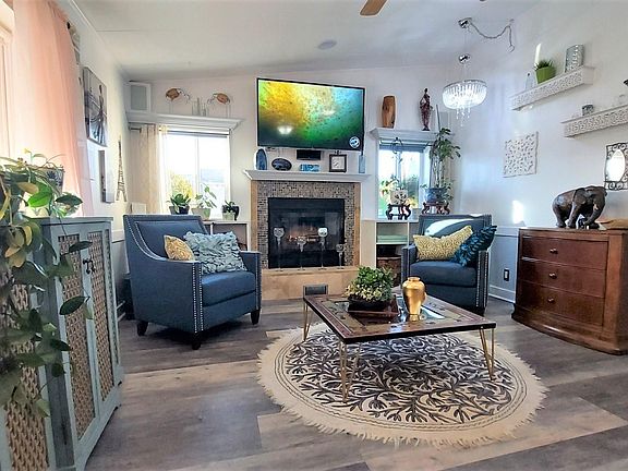 Beautiful updates in this 1986 MH in all-ages park, King Village. Cozy up by the wood burning fireplace, or sip a beverage outside on the deck. Soak in the heated whirlpool tub. Enjoy listening to your favorite tunes or movies with built-in surround sound. Newer Kitchen appliances, cabinets have been refreshed and updated. Vaulted ceilings. Living areas have scratch proof vinyl plank flooring. Newer windows, whole house re-plumbed, new vapor barrier, 2022. Convection micro stays. Washer and Dryer stay.