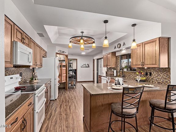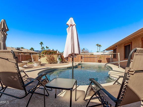 Warm & inviting home on spacious corner lot, perfect for relaxing & entertaining! Enjoy sparkling play pool, resurfaced with Pebble Sheen (2015) featuring automatic cleaning pop-ups variable-speed pump + private hot tub! The updated kitchen shines with a 2019 remodel and new appliances, while vaulted ceilings & tile flooring flow throughout. New roof (2016), AC (2013), and a privacy fence with modern metal pergola built for entertaining(2021)! The large patio is ideal for gatherings, & grassy area is perfect for pets. Retreat to the oversized bedroom suite w/large shower, & enjoy spacious closet & ample storage in the garage & attached storage room.Sun City West offers an active adult lifestyle, with 4 recreation centers, 7 golf courses, pools, fitness centers & clubs, medical, shopping & training fields nearby! This incredible 55+ community is full of conveniences and this exceptional floor plan is build for those ready to continue their active lifestyle surrounded by friends, fun and spacious living!