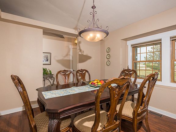 The first thing you see coming up to this property is the idyllic front porch, perfect for relaxing after a long day w/Pikes Peak views in the distance. Main level offers formal dining, large open living room w/stone fireplace, master bedroom includes a 5-pc master bath & 2 additional bedrooms. Do your dishes under a window overlooking the iconic Rocky Mountain range, in this kitchen that's equipped w/upgraded appliances. Downstairs is recently upgraded & includes walkout access, craft/hobby area, movie theater (screen & projector included with sale), wet bar (plenty of cabinet space, fridge & sink), 2nd utility hook up area complete w/sink & storage, 2 large bedrooms & bonus room or additional bedroom (currently used as home gym!) This 2.5 acre property is completely fenced. Home also boasts three car garage (21.4x23.6), 2 storage sheds, raised garden beds w/perimeter fencing & an oversized chicken coop! Award winning Falcon-49 schools w/close access to Denver & Colo Springs commute.