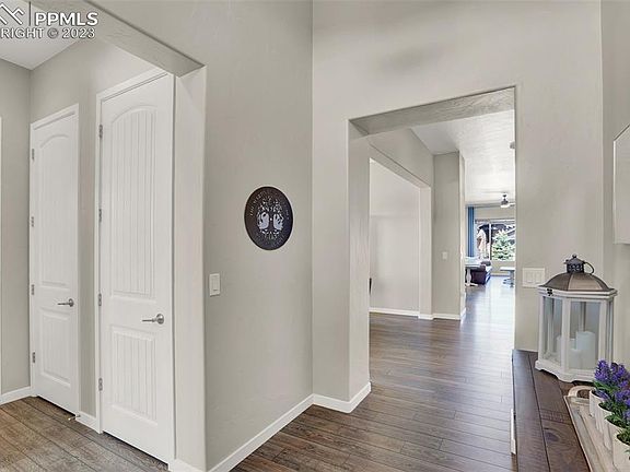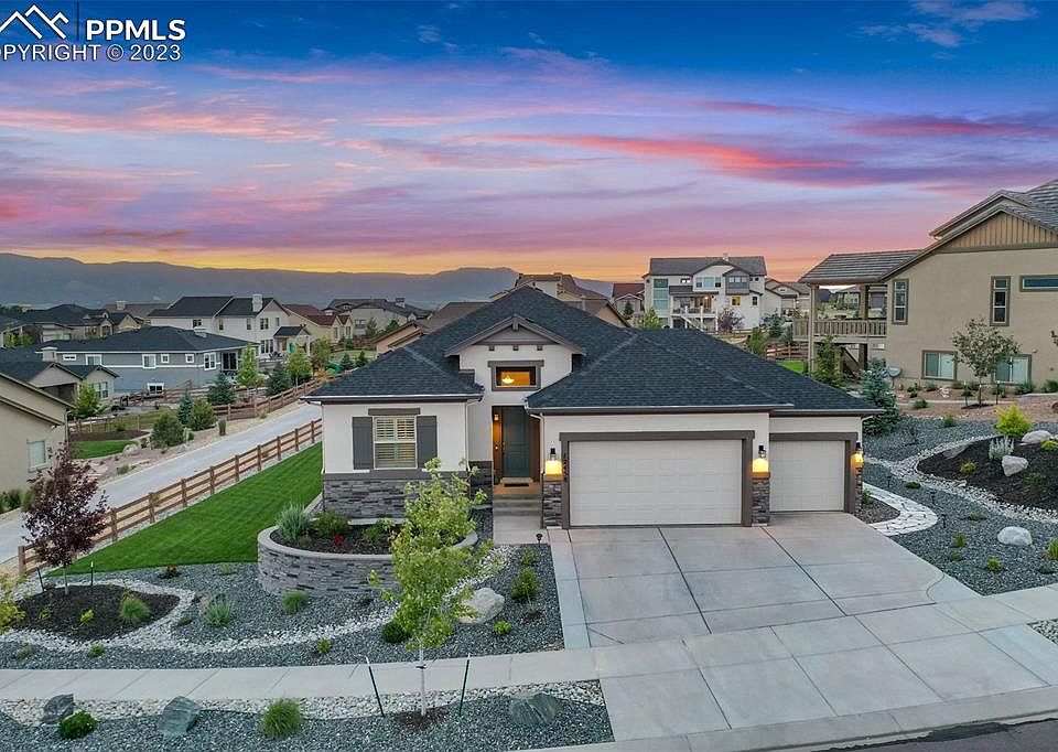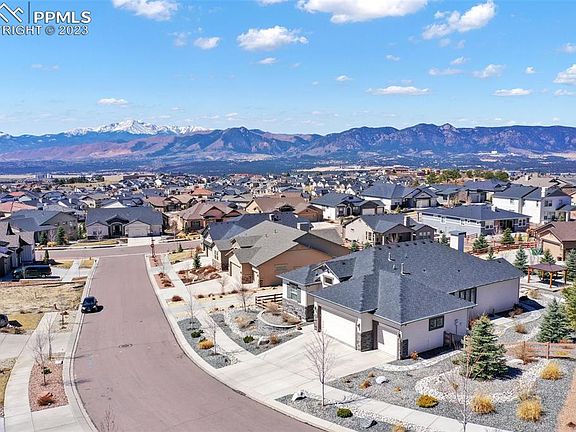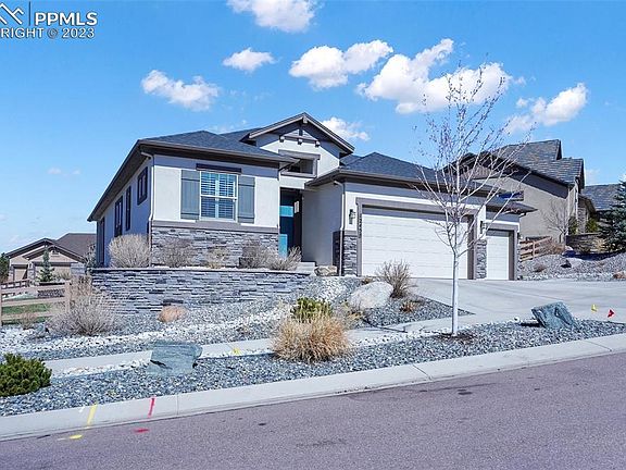 Stunning ranch plan model in the golfing community of Flying Horse. Better-than-new construction with Pikes Peak and mountain views, spectacular low-maintenance landscaping, and custom features and window treatments. An entertainer's dream with plenty of indoor and outdoor living space. Natural light floods the open living area, where the combined kitchen, dining, and living areas lead to an expanded concrete patio and beautiful yard. The gourmet kitchen is anchored by a massive quartz island that seats 6, KitchenAid black stainless steel appliances, 5-burner gas range cooktop, custom tiled back-splash, and large walk-in pantry. Luxury Vinyl laminate flooring throughout the main level conveys a natural wood floor look while providing durability and easy maintenance! The sound-insulated master suite has vaulted ceilings and a remote-controlled ceiling fan. Enjoy a spa-like feel in the walk-in master shower, complete with a bench and multiple shower heads. Sing along to your favorite music via the Bluetooth speaker as you luxuriate in the rainfall shower head. Large walk-in master closet has built-in shoe storage and laundry room access. The main-level secondary bedroom has custom shutters and a remote-controlled ceiling fan and is just steps away from a full bath. A mudroom off the garage entry offers a built-in bench with lots of storage. The main-floor laundry includes a utility sink with direct access to the mudroom and garage entry. The fully finished basement has 9’ ceilings, is plumbed for a wet bar, is wired for surround sound and a projector, and has plenty of room for a ping pong table and/or pool table. It includes a Junior ensuite with full bathroom and walk-in closet and two additional basement bedrooms with a full bath and dual vanities. The oversized three-car garage is insulated and finished. Additional upgrades include (2) 50 gal hot water heaters and a radon mitigation system. Don't miss the opportunity to make this home yours!