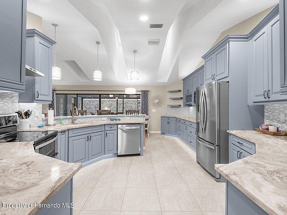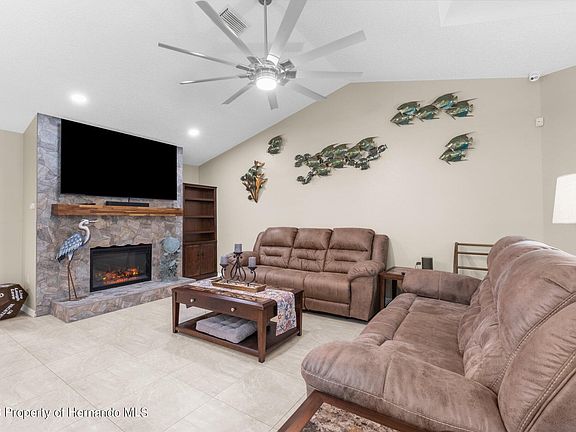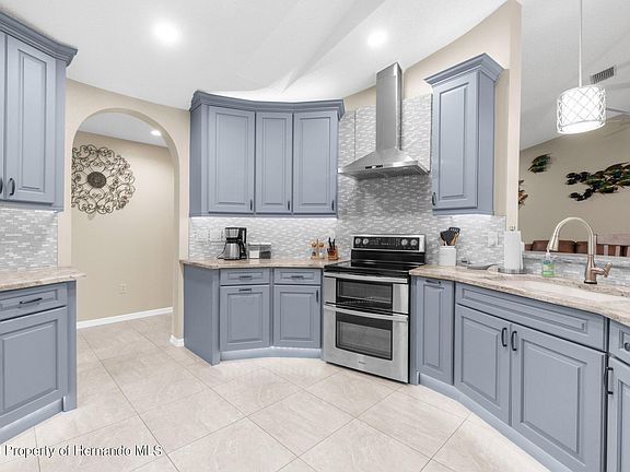 STUNNING GORGEOUS NEW KITCHEN with HEATED POOL on a CUL DE SAC in the highly-desired East Linden Estates where all the lots are oversized and the homes are custom large homes!! Move-in ready, well-maintained, loved and very clean, this home offers 3 bedrooms + 2.5 bathrooms + 2 car garage + stone fireplace + INCREDIBLE OUTDOOR LIVING SPACE completely screened and includes a heated pool with in-water seating and table, large brick pavered deck, TWO large covered lanai areas with TVs and an outdoor kitchen and kegerator + hot tub + large fenced yard for your family and pets!! You will want to just live outside enjoying the beautiful weather, entertaining your friends and family, or relaxing with your coffee and book or watching the games on TV while the family is swimming or playing in the yard!! This home is LARGE with almost 3,000 sq ft of living space; 3821 total! High ceilings, large windows and sliders, and an open floor plan make this home feel light, bright, and cheery! The remodeled, upgraded, GORGEOUS round designer kitchen with granite countertops is the CENTERPIECE of this home - it looks like something out of a magazine!! The kitchen offers new upgraded stainless steel appliances, range hood, real wood cabinets and floating shelves, under-mount sink, designer faucets and lighting, with a stunning round granite breakfast bar so everyone can see and talk to each other while sitting down! The kitchen is open to the large family room with stone fireplace, large glass sliders overlooking the lanai and pool area! Open up the sliders combining the indoor and outdoor living space and and you have a party home for entertaining!! There is room for everyone with a large living room/game room + family room + dinette area + formal dining room + a LARGE remodeled laundry room with new real wood cabinets to give you additional storage space (it even has outlets in the cabinets to charge your things!)! Newer washer and dryer included! Split floor plan offers complete privacy for the master suite! The master suite is spacious with an ensuite bathroom that is as large as a bedroom itself and has pool access, large soaking tub, walk-in shower, dual sinks, separate vanity area, and a LARGE walk-in closet!! The home is impressive just driving up to it with the GRAND entrance home at the end of the cul de sac! Landscaped with great curb appeal! Located close to groceries, shopping, restaurants, the hospital (which was just purchased by Tampa General Hospital), the Suncoat Parkway for quick and easy access to Tampa for work and play (35 minutes to Tampa International Airport! 1 hour + to TOP US BEACHES! 20 minutes to the sunset at Pine Island; fishing, swimming, boating, kayaking the clear Week Wachee River, seeing the manatees, dolphins...everything is so close! Roof 2008, TWO NEW AC UNITS in 2020. Call today to come see this immaculate home!