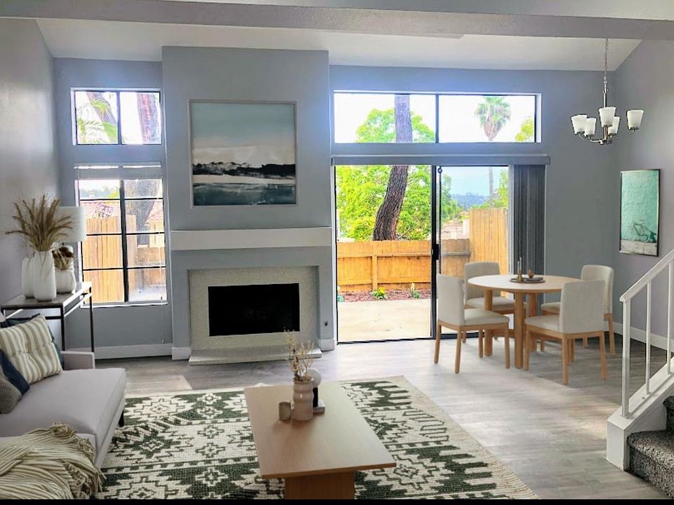 Gorgeous remodel, perfect location! End unit, 2 bedroom townhome with all new kitchen, bathrooms, flooring, lighting, window coverings and painted in a lovely grey tone, nothing left untouched. South facing and filled with natural light, this home feels larger with its high ceilings and accent windows. Two car attached garage, backyard with new landscaping and drip irrigation, washer and dryer, new water heater and gas fireplace. Located in the Sunstream community, across from one of the two pools and around the corner from Carmel Grove Park. Close to the San Diego Corporate Center, many highly rated schools, One Paseo, the 56 and the 5 freeway. Available now, one year lease, no pets, $4000 per month, $4000 security deposit, must have excellent credit and references. Tenant pays all utilities. Tenant pays utilities, no pets, no smoking, security deposit paid at lease signing, online application.