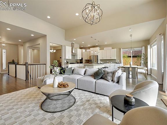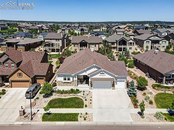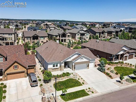 From the outside in this fully landscaped home with unobstructed views of Pikes Peak has it all. Entering the home through the front door you are met with natural light flowing throughout the open concept main level. The the expanse of the main level opens to a spacious living room with gorgeous stone fireplace. The living area flows seamlessly into the eat in kitchen that boasts a barstool height center island, ample counter and cabinet space, stainless steel appliances, gas cook top, and double oven. The kitchen provides access to the formal dining area for ease. The main level walks out to a beautiful back patio and yard accessed by two sliding glass doors that can be opened to bring the outdoors in for the gorgeous summer months. Off the living area, the large master bedroom stuns with an ensuite bath including double vanity, walk in shower, and spacious walk in closet and dressing area. A bonus is the laundry room just beyond the walk in closet leading into the mudroom with access to the garage. Bedrooms two and three with another full bath are also on the main level The basement is just as impressive with a large family room and bedrooms four and five with 3/4 bath. The basement features an incredible play area including a built in playhouse with slide. This home has it all and is located in the sought after Flying Horse community, around the corner from the incredible club at Flying Horse with a stunning outdoor pool for summer fun, basketball courts, kids care, an award winning day spa, and a golf course. The spa captivates you as you walk down into the grotto setting and features massages, facials, and much more. The club also features fine dining and hotel accommodations for your out of town guests. Within the neighborhood, there are parks, walking paths, and an amphitheater a few streets over used for summer entertainment. The home is also minutes away from all the entertainment and incredible eats on Northgate boulevard and Voyager Parkway.