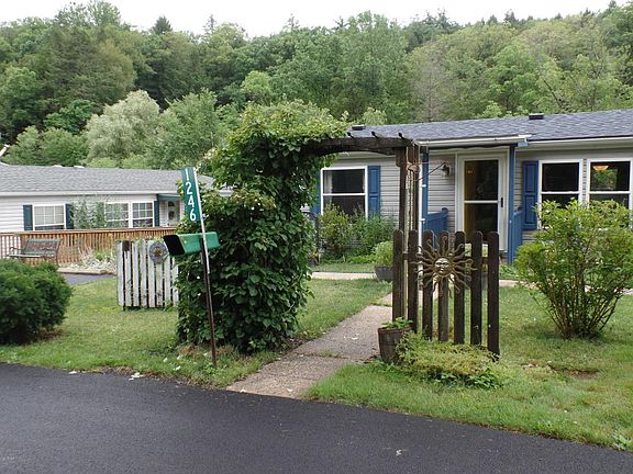 Come to Blue Mountain Village .Hear the water flowing in this 3 bedroom 2 full bath gas fireplace in living room central air full appliance modern kitchen. Spacious deck. Nature at it's best. Storage shed with electric.Clubhouse.