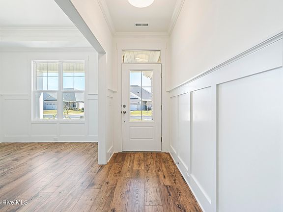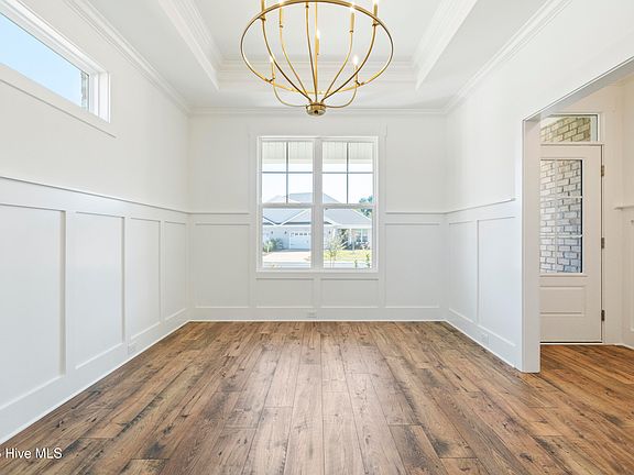 Experience the ease and elegance of new construction in this thoughtfully crafted villa by American Homesmith, perfectly situated in the vibrant, amenity-filled community of Palmetto Creek. A welcoming rocking chair front porch invites you to enjoy a low-maintenance, coastal lifestyle. Inside, a warm and spacious foyer opens into a formal dining area adorned with detailed wainscoting and a tray ceiling—ideal for hosting family or friends.