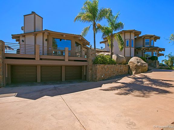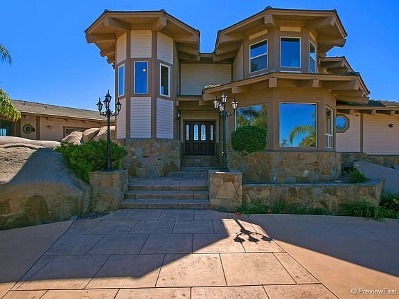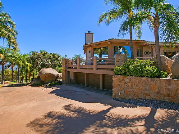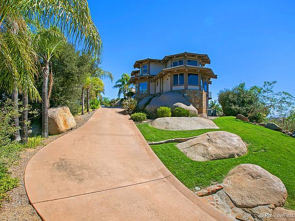 Amazing one of a kind, tri-level spectacular home, perched up in the rolling hills of Northern Escondido, feels rural but minutes to freeway. Situated on 5+ acres; Top of the mountain and miles of panoramic views! Custom built into natural contours of massive boulders, remodeled, upgraded, open beamed ceilings, and extensive stonework & timber beams. Home has solar panels for practically zero electric bill. Has amazing wine cellar, home automation, giant deck, huge garage, custom pool/spa w/ waterfalls.