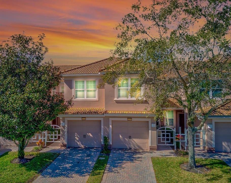 Welcome home to guard gated water front condo that offers one of the best water views in the community and from it's west facing, tiled floored, screened in lanai it provides Spectacular Florida sunsets. Two bedrooms, two baths and a flex room that could be used as an office, den or third bedroom. This first floor unit provides easy access from the one car garage and offers a split floor plan for extra privacy. It has 9 foot ceilings and an open concept living area giving it a spacious feel and amazing view through the home of the beautiful water vista. Other features include crown molding, stainless steel appliances, laminate flooring, double pane energy efficient windows and ceiling fans in most rooms/ The garage has a finished painted floor and a custom modular shelving system for easy storage The AC unit was replaced in 2016 and the kitchen was updated to include new appliances, sparkling quarz countertops and backsplash in 2023. Bella Trey is not just a community, it is a lifestyle, with its resort style year-round pool and spa, tennis court and putting green. The private clubhouse features amenities such as a library with sitting area, fitness center, flex fitness space and billiards room. They have a full-time lifestyle Director on site and it is a guard gated community. Dont miss out on this Florida Gem, schedule your tour today!