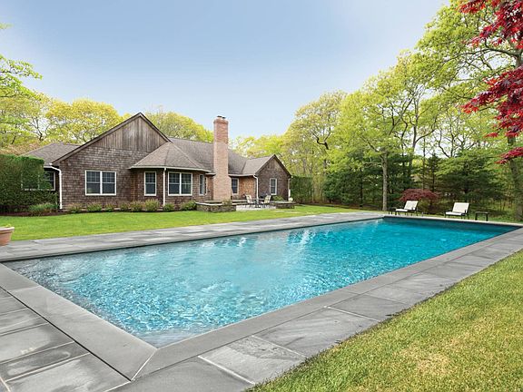 Located on a quiet street in between Sag Harbor and Sagaponack, this one level, four bedroom four bath home is the perfect summer getaway. The home features a large eat in kitchen that overlooks the pool and patio area. The living room has vaulted ceilings with a fireplace. The master bedroom is located on one side of the home, and the other three bedrooms are on the opposite. The pool and patio are surrounded by beautiful gardens and a green lush lawn.