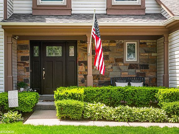 BEST DEAL in sought after Old Farm Village offering quick close - 3 bedroom 2 1/2 bath east facing home with finished basement. The charming front porch opens to the homes' foyer and living room with adjacent dining room. The large sunny kitchen with quartz counter-tops and custom back-splash, garden window offers generous cabinetry for storage. Family room with cathedral ceiling, dual skylights, fireplace w/ gas starter is the ready for your relaxing evenings and entertaining guests ...A great "drop zone" for the kids waits in the hallway that joins the garage. Upstairs find the enormous primary suite with sitting room/office/nursery and walk-in closet and full bath with skylights, over sized soaking tub, separate shower, double vanity and heated floor. Two secondary bedrooms share a common hallway updated bathroom. Finished basement has newer carpeting as well as generous storage. Beautifully landscaped yard with mature trees and fencing on 3 sides of the backyard .This home is filled with updates: New washer & dryer 2022 New Furnace/AC 2021, disposal 2019, roof 2018, siding 2012, carpeting 2018, All new windows - Custom blinds .Updated lighting inside and out . Award winning schools, don't miss this home !
