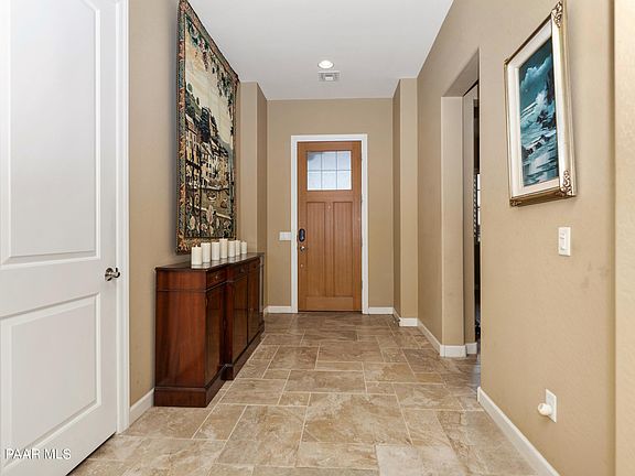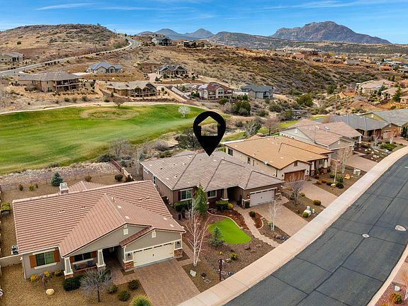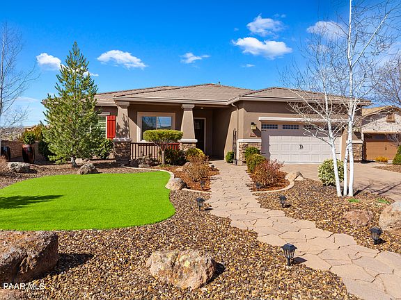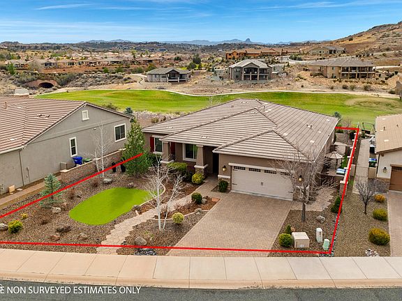 Curb appeal starts at Sarafina w/fragrant rose lined decorative paver path accented by EZ care turf on one side further enhanced by professional landscaping. Paver drive & walkway lead to covered front Porch & tall Prestige security screen + front door w/glass insert Entry of this highly upgraded Spyglass 2195sf one story w/Primary Bed + EnSuite + Den, 2.5 Baths + 4' extension on 2 Car Garage [635sf]. The perfect Great Room plan w/corner stone fireplace & wall of oversized sliding doors opening to covered Patio & stunning golf + mountain backdrop. You'll love both the Indoor & Outdoor Living Spaces which include expansive covered & open specialty paver Patios, built-in rock firepit, multiple EZ care turf areas, large boulder accents, stone benches ... An inviting space to relax & enjoy