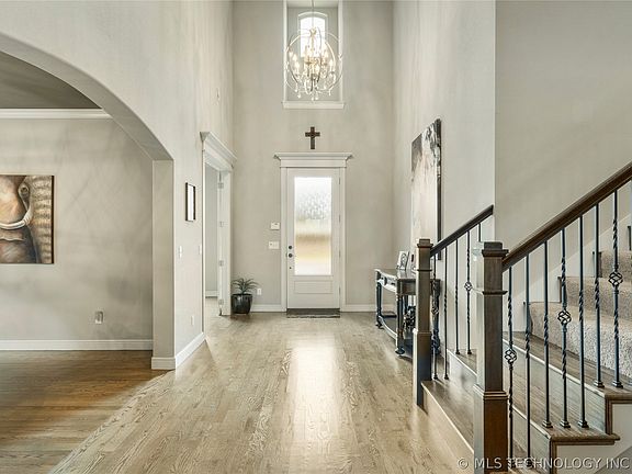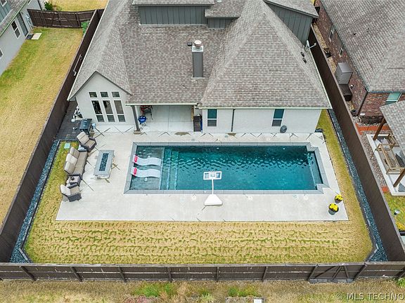 A meticulously crafted home located in the Quail Creek of Bixby subdivision! There is a unique feature at every turn, from the Jay Rambo custom cabinets, an oversized master bedroom with his and her closets, an exceptional master bathroom, a storm shelter under the stairs, a media room upstairs, and so much more! The outdoor setting is serene with a built-in gas fire pit, a gas fireplace, and a 7 ½ ft Hayward heated pool system with an OmniLogic computer system to make it all controllable by your phone or Alexa! Floor jets for cleaning, granite surrounding, & a shed for the pool equipment. This is one you have to see to believe!