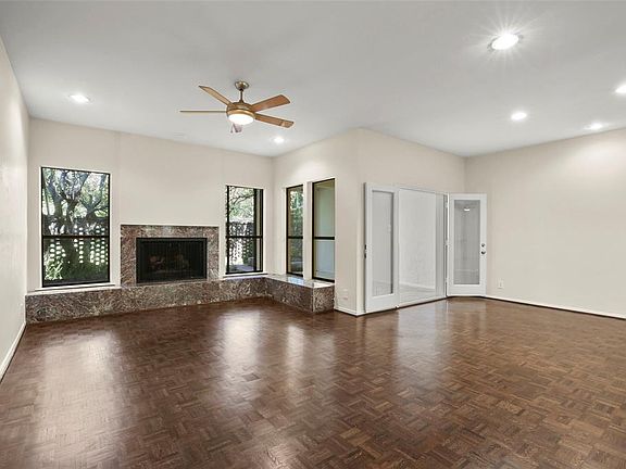 Stunning modern townhome w PRIME location in Preston Square! This home features upper & lower sunrooms which provide abundant natural light throughout. Spacious master suite has peaceful views of greenbelt, vaulted ceiling, 3 standard closets + large walk-in. Contemporary kitchen opens to dining-living w hardwood parquet floors, built-in bookcase-dry bar & gas fireplace. SS appliances include double ovens & built-in microwave. Large desk area off kitchen is perfect for home office. Huge lower sunroom leads to shaded patio w latticed brick fence for both privacy & expansive views. Separate laundry room. Composite roof, gutters & chimney cap all replaced in 2019. Enjoy community pool, tennis courts & clubhouse.