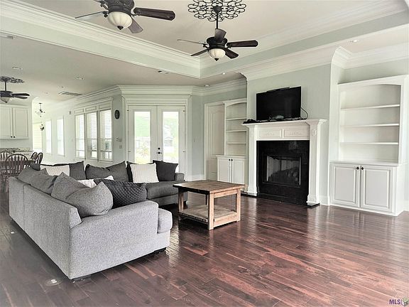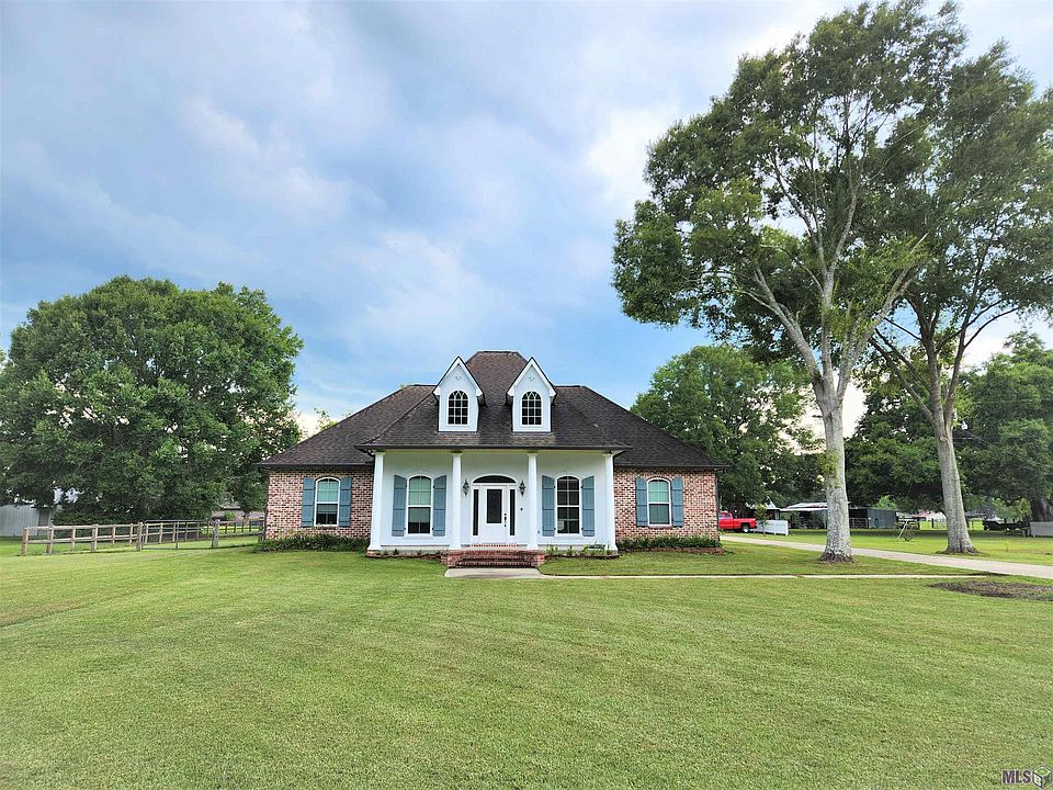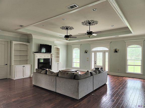 Enjoy tranquil country living on this great tree shaded lot! Welcoming front porch leads you into this lovely 5 bedroom, 3 full bath home with over 3,900 living area. Open floor plan is great for entertaining. Beautiful hand scraped wood flooring flows throughout the main area with ceramic tile in all wet areas. Family room offers high ceilings, extensive crown molding, & gas log fireplace. Kitchen is fantastic in design with gas cooktop island, peninsula, loads of cabinet / counter space, double wall oven and huge walk-in pantry. Beautiful formal dining area and separate breakfast or keeping area is also part of this open space. There is a large bedroom that is sound proofed just off of the family room and a full bath near the side entry which makes easy access for guest. Hall corridor offers a wall of windows so you can enjoy views of the covered patio and yard. In the rear portion of the home you will find 4 bedrooms, 2 full baths, living room, office, hobby room / nursery and huge mudroom / laundry area (Original hook ups for old kitchen refrigerator water, range, and water remain in place). This area offers laminate flooring to make for easy cleaning. Exterior amenities include over 800 sq. ft. of covered porches and or parking, 24 x 20 pole barn that has been enclosed & 20 x 30 RV / Boat port. Home did NOT flood in August of 2016. Call for your private showing today! Owner / Agent