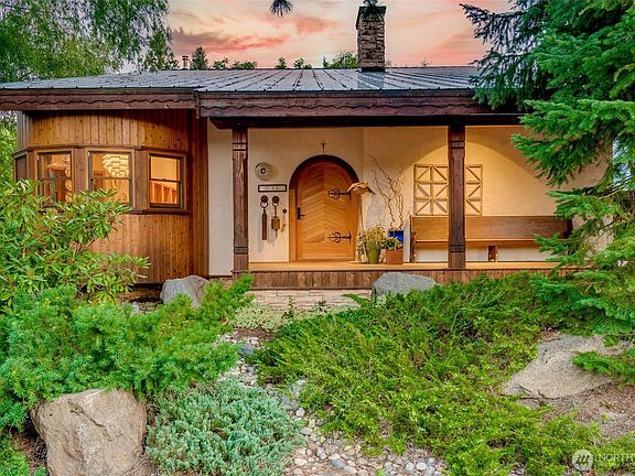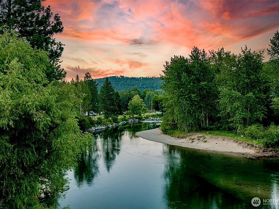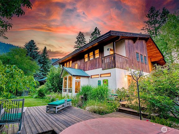 Custom Alpine inspired home situated on two-thirds acre & 212' of prime Icicle riverfront. 3,600 sq ft. of living space, new paint & new carpet, the design captures nature & attains a modern & dramatic appearance. Jay Acheson custom woodwork throughout. It offers 4 bedrooms, 4 baths, generous open kitchen with river rock granite. There are 3 separate bedroom decks taking advantage of river & enchantment views, unparalleled outdoor living space with steps to the river. High vaulted wood ceilings, compliment the great room with double sided wood burning stove & formal dining. Additional living offers large view windows, kachelofen stove & steps to patio living. Detached 2 car garage with space for ADU.
