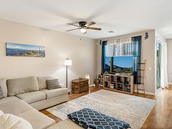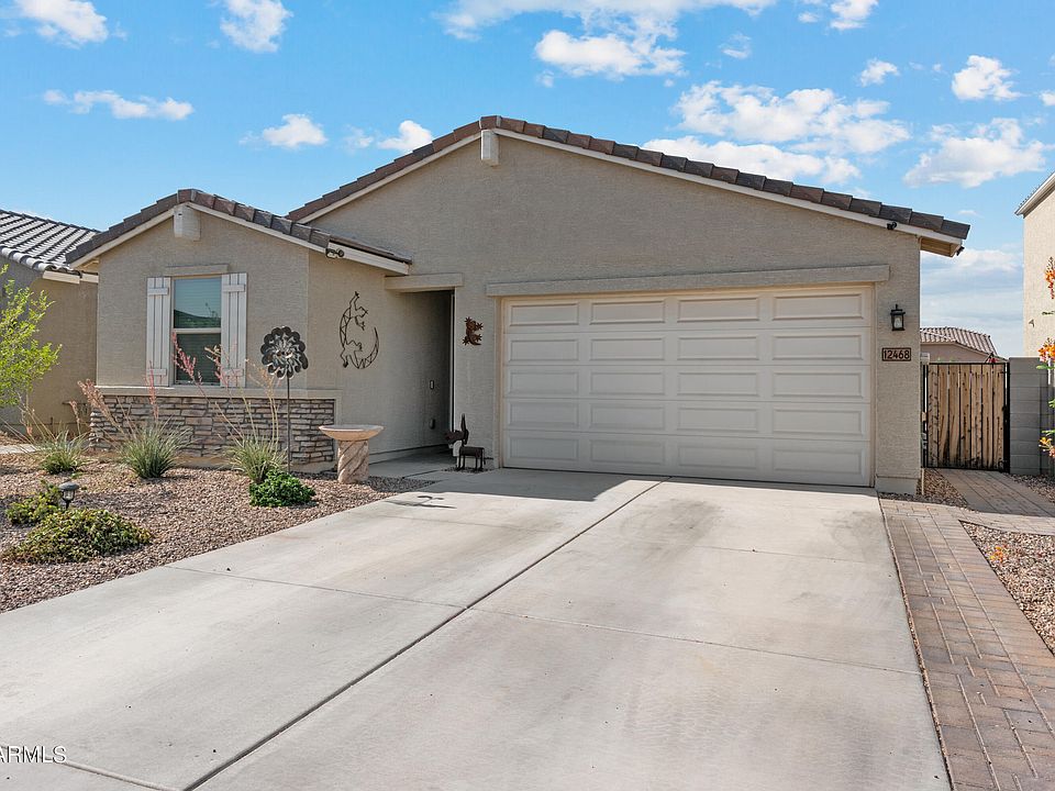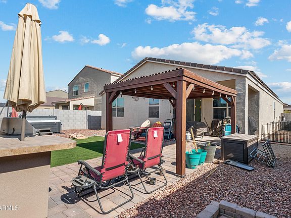 Many extras in this well-located West Valley SMART Charmer built by Meritage! The professional desert landscaping in front offers automatic seasonally SMART irrigation system! Sprayed-in foam insulation with a 35-panel loan to own solar system pmt $215 maxed pmt. Security storm screen door at entry front. Upgraded custom high maple cabinetry in kitchen appointed with beautiful slab granite island breakfast bar and counter tops. Separate Pantry and SS appliances complimented by neutral paint color. LVT throughout living areas with carpeted bedrooms. Vaulted ceilings. Whole home water softener, water filtration and RO combination are owned and will transfer. The beautiful backyard has been professionally landscaped with play area, paver walkway, pergola and great area for BBQs!
