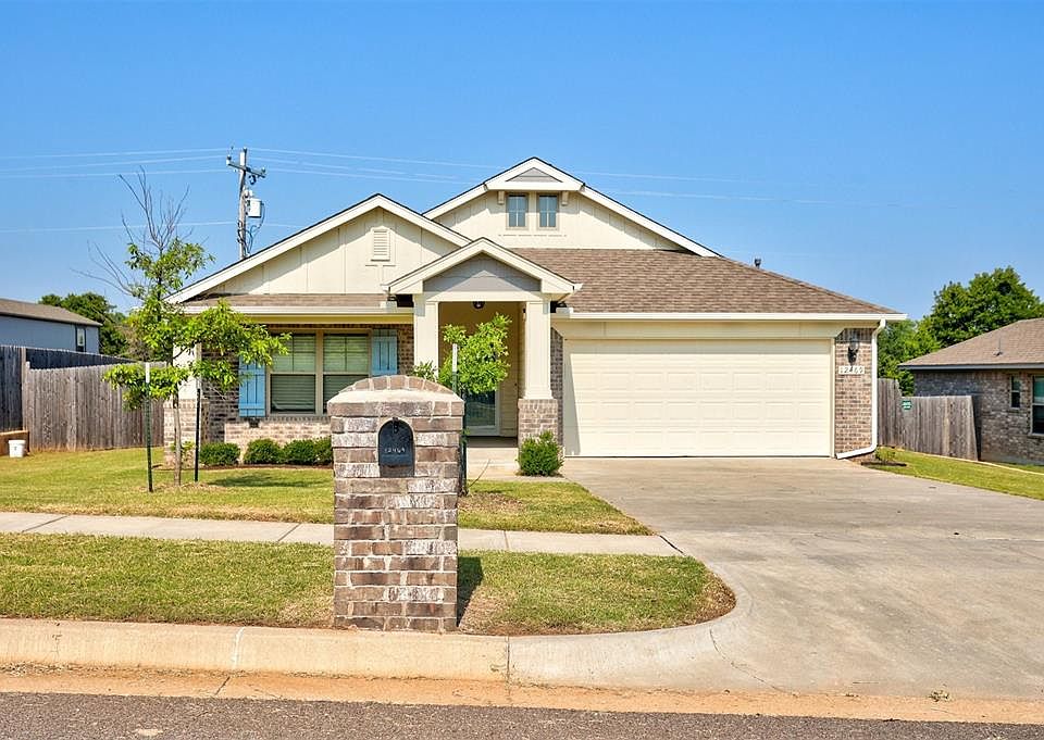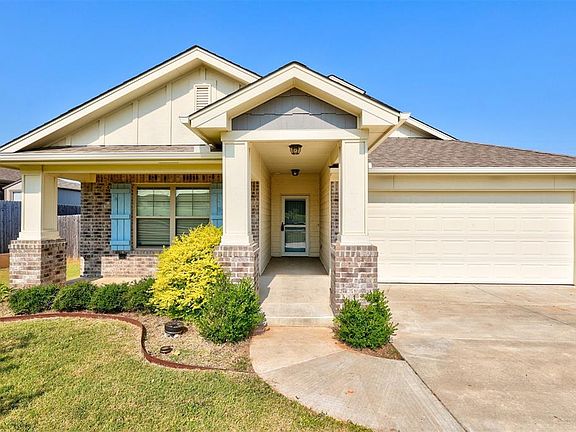 Price Reduced!!!!!As you enter this home, you’ll notice the beautiful kitchen and large open living area. Great kitchen with quartz countertops, stainless steel appliances, and a eating space. This home is nice and light and airy with tons of windows. Laminate flooring in living area flooring that runs through the hallway back to the two bedrooms that are both good size with walk-in closets. The hallway bath is a great size with unique mirror. The master bedroom is great with barn doors, shower, and a nice tub. This home backs up to a beautiful pasture with rolling hills. Nice back patios to watch those Oklahoma Sunsets. Great privacy fence also. Wonderful utility room that leads out to the oversize two car garage. This neighborhood has beautiful walking trails, playground, basketball courts and picnic tables. Close to Tinker Air Force Base and just minutes away from I 40. Home is located in Choctaw school district also.