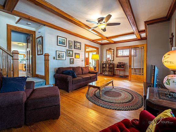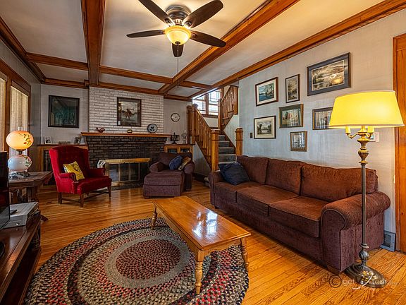 Well maintained 2 story home with lots character. Formal LR and DR, remodeled kitchen & bathrooms. The Living room has built in bookcases next to the fireplace, Dining room has built in buffet & plate rail, both rooms have hardwood floors and beams on the ceiling. The kitchen was expanded & redesigned in 1999 with many cabinets, large pantry cabinet, main floor laundry with half bath. There are 3-4 bedrooms upstairs, full bath, enclosed sunporch and walk-up attic. 1 car detached garage with shared driveway and expansive backyard. Updated landscaping, metal roof and large open front porch with swing. Yard goes back to the fence. Fireplaces have not been used in 40 years and chimney is covered and capped. Universal Home Warranty is offered to the buyer. Owner is a licensed IL Realtor. Please continue to Show