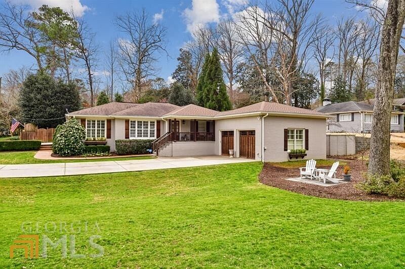 Nestled on a gorgeous deep lot with lush landscaping, this Brookhaven charmer is designed for entertaining with fabulous outdoor poolside living at its best. Move right in this pristine brick traditional with flexible floor plan and absolutely stunning heated swimming pool with total privacy in your own oasis. Inviting covered front porch with sitting area sets the stage for this handsome home with designer touches throughout. The open floor plan is designed for today's life style with great flow from the light filled Living room and Dining Room to the sleek new kitchen with custom island and serving bar for casual dining. Enjoy entertaining in the spacious Family Room/Sunroom with fireplace, banquette, windows galore and brick accent wall. Walk out to your private Key West style setting with expansive outdoor patio with stone walls and fabulous entertaining areas including an enclosed outdoor bar with private entrance, half bath, and outdoor shower. Additionally there is a separate building for storing toys, floats, etc. Get ready for fabulous al fresco dining with lots of room for grilling and multiple seating areas. Relax poolside in the 12' x 20' heated pool surrounded by professionally designed mature landscaping for the ultimate private retreat in the flat fenced yard. Designer kitchen features beautiful cabinetry, quartz counters, subway tile backsplash, farmhouse sink, stainless appliances including new gas range with grill and double ovens, plus wine refrigerator. There are 3 Bedrooms on the main floor. Primary Bedroom features a walk-in closet and private bath with large walk-in stone shower with seamless shower door and multiple rain head faucets including overhead rain shower. Two additional Bedrooms on the main with full tiled bath with large glass enclosed tub. The finished lower level with full tiled bath with shower and cozy built-in bed for guests boasts exceptional storage with built in cabinets. Large laundry room in terrace level. The new two car detached expanded garage connects to the main house on the covered porch and was designed to accommodate large SUV's. There's even more storage in the detached garage. Exceptional parking for multiple vehicles with a large driveway and secondary driveway parking pad. Rich hardwood floors throughout the main house with plantation shutters. Irrigation system. Just minutes from Buckhead and Morningside/Virginia Highland with low Dekalb taxes in Lavista Park, this pristine gem is a perfect 10!