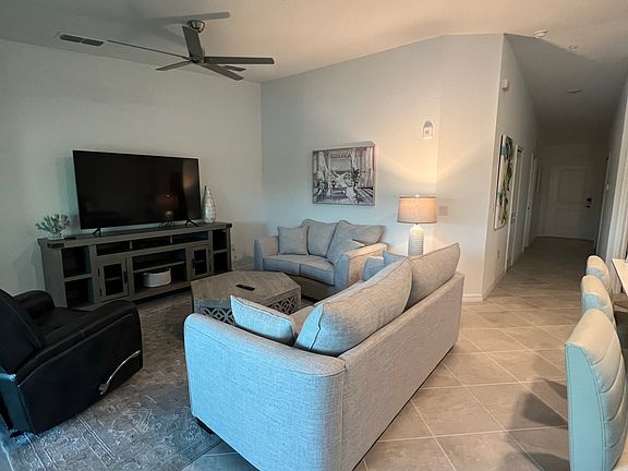 This condo features tile throughout the 2 bed/2 bath plus den configuration with an open layout amongst the Kitchen, Living Room, and Dining Room. Rear Lanai overlooks the 5th hole . Central AC, ceiling fans in the living room, both bedrooms, , and both front and rear lanais. Detached one car garage. Two Golf memberships included with transfer of membership(fee). Garbage, Water, Cable, and Internet included. Pets Considered.