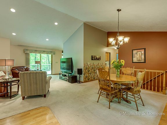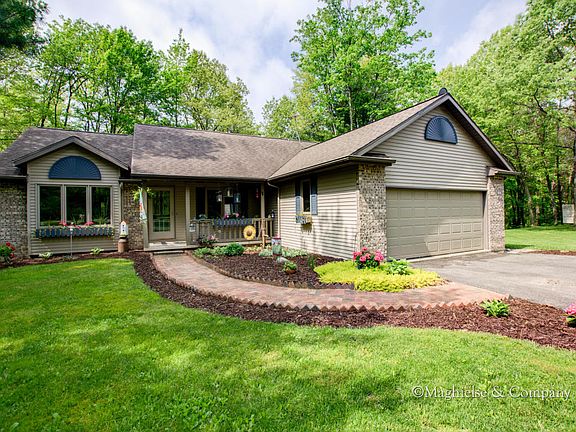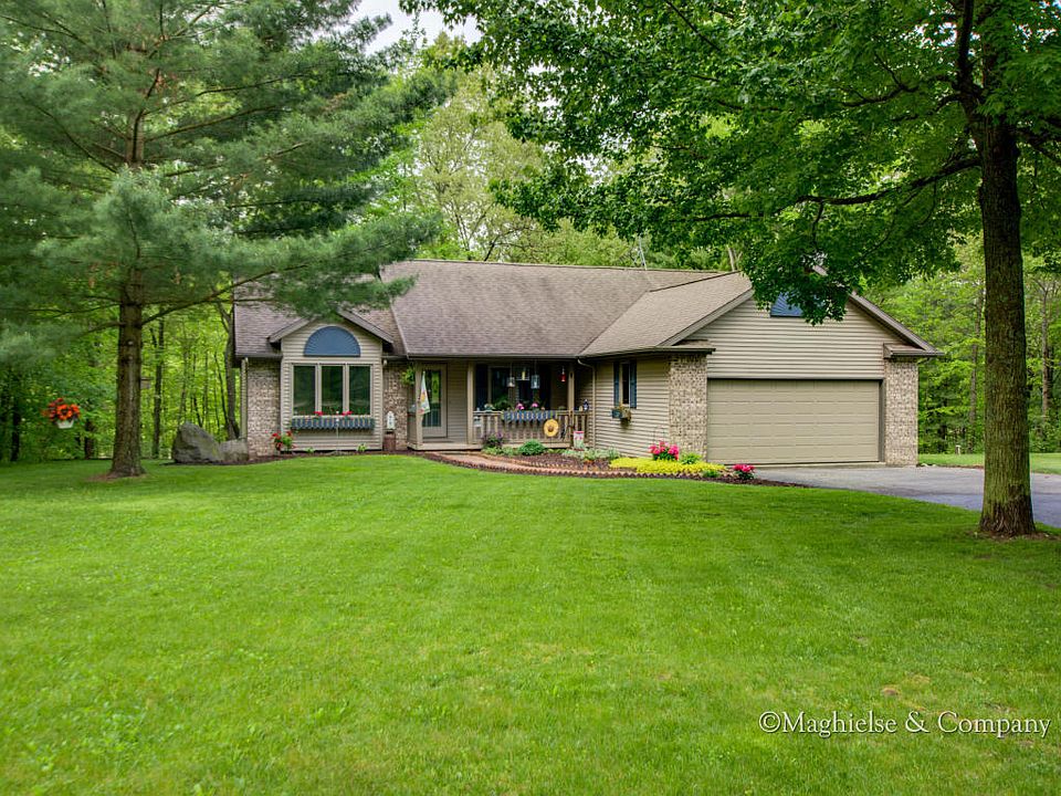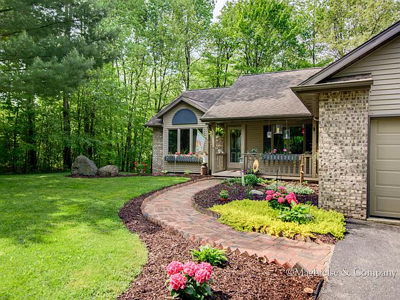 Buy this Home & We’ll Buy Yours!! (Conditions apply). Call The Maghielse Team 616-977-0900. This beautiful 4 bedroom, 2 bath ranch is perfectly situated on 5.27 wooded acres. Impeccable landscaping presents maximum curb appeal. A brick paver path leads to the welcoming entry, and access to the wonderful open floor plan with vaulted ceilings. Conversations flow easily from one room to another, making entertaining a breeze. A good-sized dining room offers plenty of space for sit down dinners, and the living room has sliders to the deck overlooking your backyard haven. Great space to enjoy nature while entertaining, relaxing, or cooking your favorite steak on the grill! The kitchen offers a breakfast nook overlooking the tranquil setting, and you’ll love the abundance of cabinetry, with plenty of space above for displaying collectibles. A good amount of counter space is accented by ceramic tile backsplash and under-cabinet lighting. And the appliances stay for you to enjoy. You’ll find the main floor master suite to be spacious, and boasts a private bath with convenient walk-in shower, and a luxurious soaking tub. The entry from the garage offers a great mudroom area plus the laundry. 2 additional bedrooms and a 2nd full bath complete the main floor. The walkout level is ready for fun and games in a good sized family room with gas fireplace, and slider access to the backyard patio where you’ll also find electric hook-up for a hot tub. This level is home to bedroom number 4, is plumbed for another full bath, and offers great storage space. There is also a storage shed with 60 amp service and water! This natural setting offers a good amount of space for fun and games, including a great fire pit area for gathering around. Easy commute to Grand Rapids, yet you’ll feel this is a tranquil retreat. Call now for a private tour.