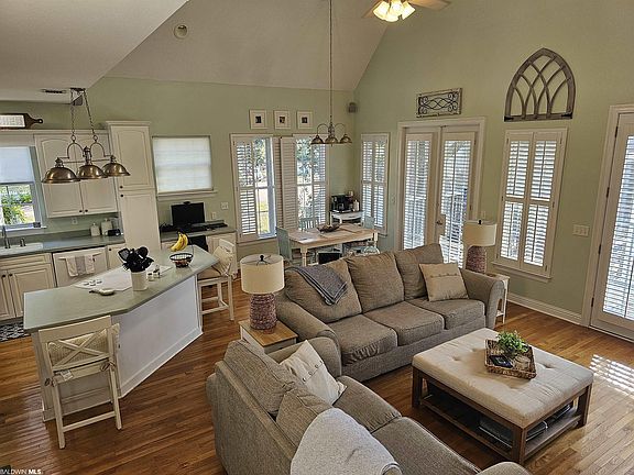 Beautiful raised beach cottage in Bay Gardens coastal community situated on Mobile Bay on the Fort Morgan Peninsula, Gulf Shores. This stand-alone home features two large bedrooms each with it's own bathroom. Living/dining open concept, kitchen with solid surface breakfast bar and cook top, modern white appliances, and plenty of cabinets, lots of natural light, plantation shutters on most windows and french doors that open onto the roomy screened porch. Sit and enjoy your morning coffee with cool Bay breezes. Main level has hardwood floors. Primary bedroom with ensuite his and her vanities, separate shower, his and her closets plus a side balcony to enjoy some privacy. Upstairs has large guest bedroom, bathroom with tub/shower, double vanity and sitting area on the landing. Downstairs features laundry, lots of storage space an outdoor shower and covered parking for multiple vehicles. Alarm system and generator. Private community with a new boat launch, trex decking fishing pier and first-come-first-serve boat slips. Well maintained common areas, cobblestone streets, gazebo and a community clubhouse with full kitchen for your special events. Don't miss this adorable cottage minutes from the beautiful Gulf beaches, Bon Secour Wildlife Refuge, Golf Courses, restaurants and more. Bay Gardens allows 30 day rentals. See this outstanding home today.