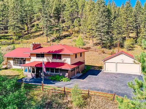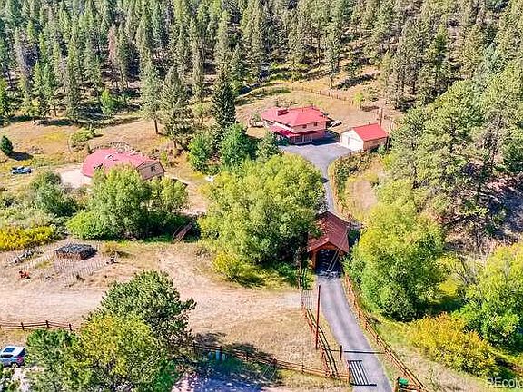 Unique equestrian property with outbuildings, natural water/pond, and quiet solitude yet close to the town of Conifer for all your everyday needs. Short commute to downtown Denver. Solid contemporary-style home in excellent condition with attached garage and a separate detached garage. There is also a large barn with more than 4 garage spots and guest/living quarters/art studio/office above. Property includes a nicely built and maintained storage shed/tack room and 2 stall pole barn. Total building areas of 7039 sq. ft. per county records. Buyer to verify. 5 bedrooms, 4 baths, and 10 parking spaces. Beautiful elevated land behind the house creates privacy and a forested backdrop. The meadows have potential for a nice arena. This home with outbuildings had one owner and was meticulously maintained. Now on the market for the discriminating buyer who wants a property with multiple uses and endless potential! Ramp up the equestrian facilities or use as they are; bring your office home to the separate apartment, or rent it for long term or vacation rental. Improve the existing home (it is dated inside) or build your own. Newer roof, high quality gas/hot water heating system, beautiful moss rock fireplace, and well maintained septic system. Interior has beautiful hardwood floors, new paint, and nice quality windows. Fabulous driveway entrance with charming covered bridge and natural pond. This property has so much to offer! Don't wait! Your classic Colorado lifestyle can come true here! Owner is also selling an amazing 196 acres that adjoin this property, offered separately for $1,075,000.