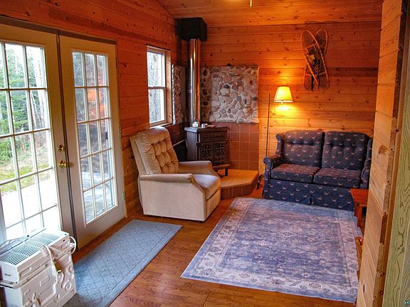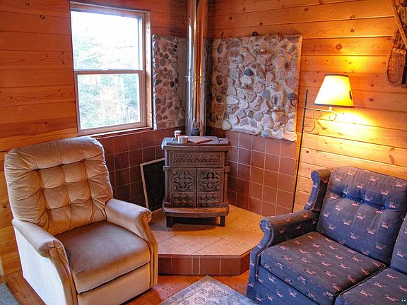 - Description: Great woodstove, opens to deck. Good place to cuddle up with a book or set of maps.
