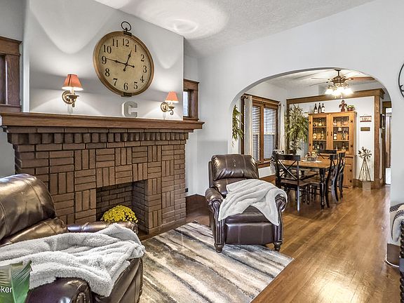 From the front porch, you'll enter a spacious living room with hardwood floors, a brick fireplace, natural wood trim, and numerous energy-efficient replacement windows that fill the space with natural light.