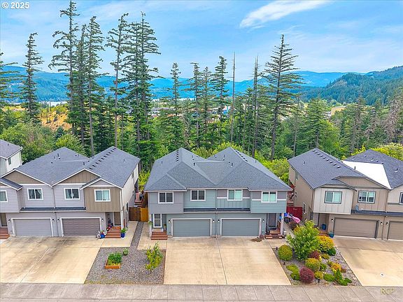 Absolutely serene describes this well maintained, move-in ready, light filled townhome in beautiful Cascade Locks. Nothing but stunning territorial mountain views to enjoy from every window. Catch a glimpse of the Columbia river from primary bedroom and back deck too. 3 bedrooms + 2 full bathrooms upstairs along with a large open landing area commonly used as lounge/tv room, office space or the like. Fiber internet makes it easy to work from home. Primary bedroom has vaulted ceilings, large walk-in closet + an ensuite. Large laundry room upstairs with plenty of space + water heater in laundry too. Kitchen features granite counters, space for barstools at the eat bar, stainless appliances and pantry with shelving. Entire home and appliances professionally cleaned top to bottom, fresh and ready for new owner! Double car garage has taller ceilings and mounted storage racks. Two charming apple trees planted in front. Composite deck off slider door is perfect for all seasons. Potential to use space underneath deck for to extra storage. Heatpump for heat & AC. Not a high maintenance home. HOA dues only $425/Year! Rear property line is estimated to be 5ft from back side of home. Plenty of extra parking places for visitors. HOA amenities include a fully fenced dog park, kids play park and gravel RV/Boat/Trailer parking too! Desirable neighborhood with all the amenities. Located in the heart of Cascade Locks, adventure is never far away. Just 20 minutes to Hood River and all the Gorge has to offer. Shown by appointment only.