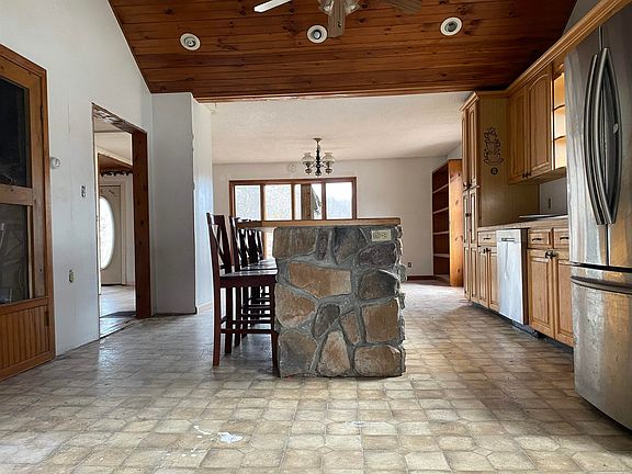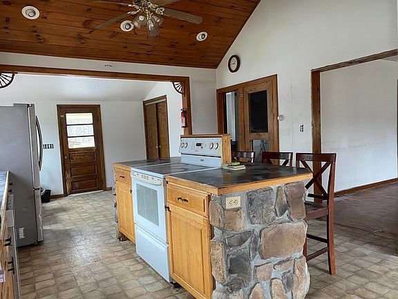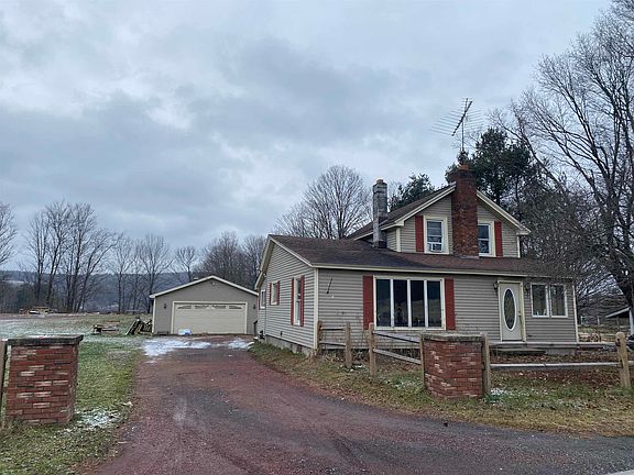 Nearly one acre of level property surrounds this spacious four bedroom home just outside the Village of Poultney. The Kitchen boasts a cathedral ceiling and a center island and opens to a bright dining room. The living room offers a wood burning fireplace and wood floors. The spacious primary bedroom is conveniently located on the first floor with sliding doors leading to a deck offering views of mountain sunsets. An office/bonus room finishes off the first floor with three more bedrooms on the second floor. The detached two car garage has a full bathroom and a wood stove. The home is being sold in AS IS condition and does need some work.
