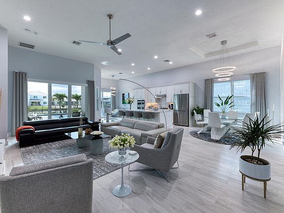 Better than new construction! Built on the best strip of lots in Windgate @ Avenir. This gorgeous home is less than a year old with all the new construction kinks worked out, plus significant custom and builder upgrades. No detail has been left untouched. As you enter the home, you will immediately notice the custom light fixtures, gorgeous kitchen with a huge center island covered with top of the line quartz and SS appliances. The living area leads to an amazing lanai and custom pool overlooking the lake. The fenced backyard has pristine landscaping and artificial turf. The Master bed and bath have every amenity you could want. All 3 bedrooms and the den/office have been upgraded with LVP flooring. Skip fighting to bid on a lot, then waiting 20 months to build. Move in NOW!
