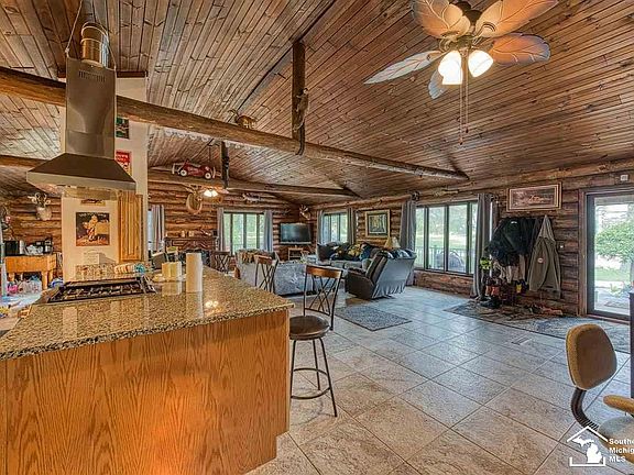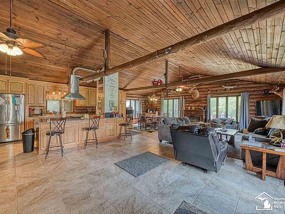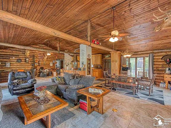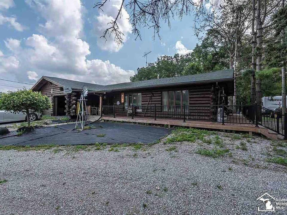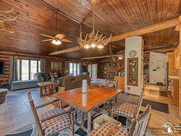 Cedar log home setting on two acres of heavy trees and beautiful scenery! Lots of wildlife, turkey, deer.... Interior is very open, kitchen has been updated with Granite tops, newer stainless appliances, gas cook top. Ceramic floors in kitchen, living and dining area. Home features a large enclosed porch overlooking the wooded area, also a wrap around porch to the front. Large 2.5 car attached garage plus a 30x40 pole barn. Home has forced and central air, also a wood burning system if would like to heat with wood. Both full baths have been updated. What a beautiful setting it feels like being up North!