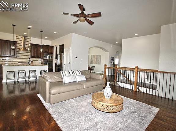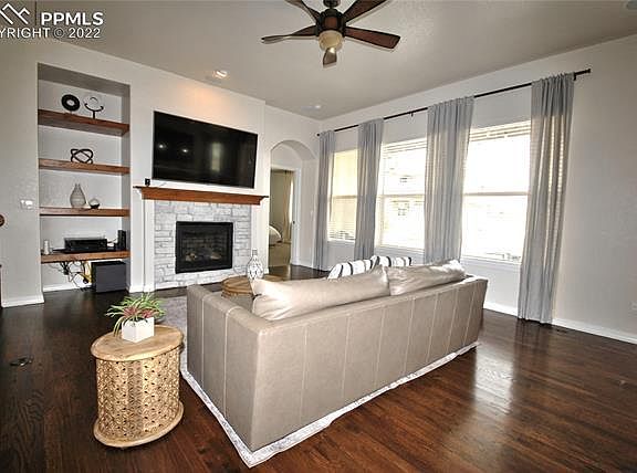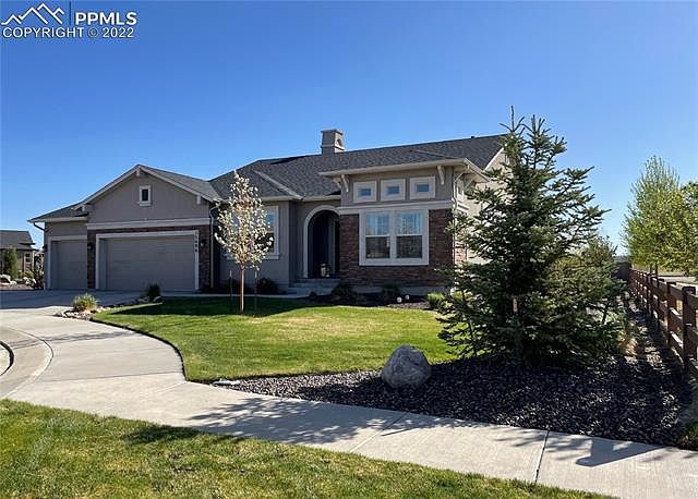 This beautiful ranch style PARADISE floor plan by Classic Homes welcomes you with rich hardwood floors throughout most of the main level. Featuring 4 bedrooms, 3 bathrooms, office and a 3-car garage, along w/the option to add a 5th bedroom Jr Suite w/private bath. Welcoming and spacious Great Room warmed by gas fireplace and features custom built-ins. Enjoy the chef's kitchen w/granite island counter bar, SS appliances, gas cooktop, microwave and wall oven, 42' Maple cabinetry and adjoining breakfast nook. Cleverly located butlers pantry/coffee bar passes through to the formal dining room which is perfect for larger gatherings. The large main level owner's suite is open and bright w/attached 5-piece master bath, double vanity, walk in shower, soaking tub and huge walk in closet. Convenient laundry room access through private owners entry. The main level also offers a secondary bedroom, full bath, and oversized office with front range views, perfect for working from home. Walk out from the kitchen nook to your covered back patio featuring gas line w/BBQ grill which makes the perfect outdoor living space. The open fully landscaped backyard offers basketball court, auto sprinklers and plenty of room for activities. Back inside enjoy the finished lower level w/large family room, gas fireplace, wet bar, ideal for guest and entertaining. Two spacious bedrooms, full bath and basement storage. Other features include, Central A/C, Custom light fixtures, Stucco and Stone exterior, finished insulated and painted 3 car garage, bench seating and cubbies off laundry room. Full SimpliSafe security system with outdoor cameras and doorbell, Ecobee smart thermostat, window well covers and SO MUCH MORE! Located close to Lizard Leap Park and award winning Discovery Canyon Campus Schools, easy access to I-25 and AFA, nearby restaurants & entertainment. Join The Club at Flying Horse for swimming, workout, tennis and golf. Don't miss this perfect opportunity to live in Flying Horse!!