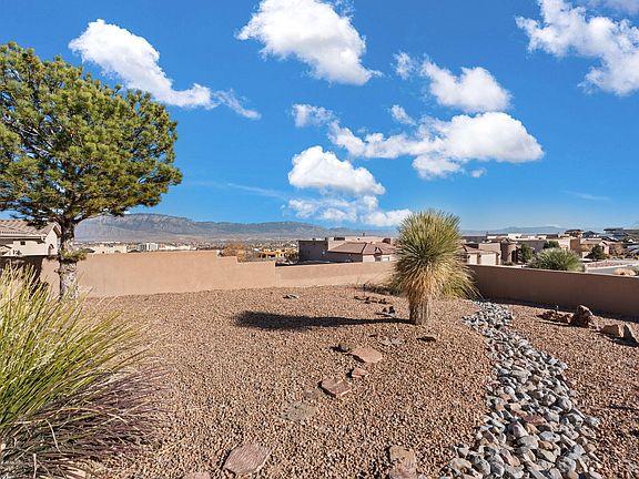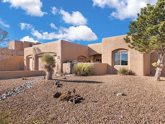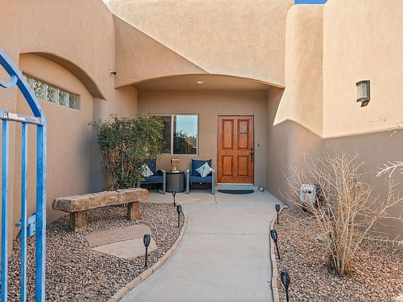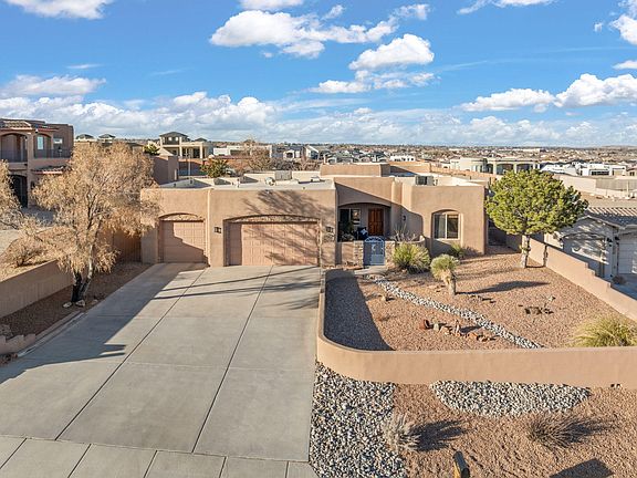 This exquisite Southwest-style home blends contemporary elegance with regional charm, offering 2,650sf with three bedrooms plus a home office (or fourth bedroom), 2.5 bathrooms and a 3 car garage in a thoughtfully designed layout. The heart of the home is a sun-drenched great room, with hand carved wood beams and a wall of windows that frame stunning mountain views. Chefs kitchen with upgraded cabinetry, granite countertops, stainless steel appliances, prep island, breakfast bar walk-in pantry and dining room. Spacious owners suite with a private bath. Bath with travertine floors, a jetted tub, 2 sided fireplace, walk-in shower and closet! Great yard with a, shed, covered portal perfect for entertaining and covered patio to enjoy those Sandia Sunsets!