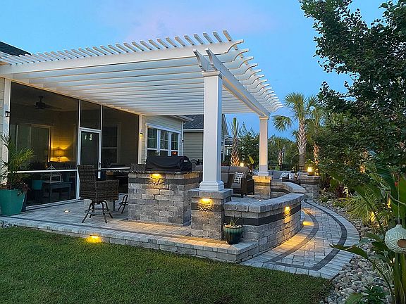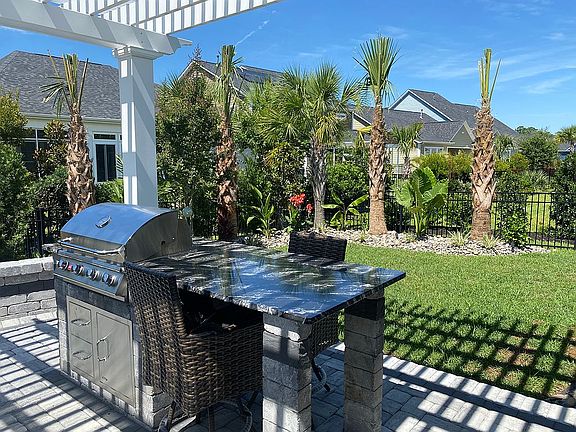 This 4 bedroom, 3 bath spacious, single level home in West Lake is nestled between Park Place and Emmens Preserve, which is right in the heart of Market Common! This home has beautiful, mature landscaping. The front yard has a palm tree, shrubs, and flower beds which lead you into the serene 12x12 gated courtyard and your front porch with an 8' tall grand double door entry into a large, lovely foyer with tray ceiling and a recessed, lit wall niche to the right along with 2 coat closets. The foyer opens into an expansive great room that boasts 10' ceilings, a ceiling fan, and a large recessed niche, which provides the perfect spot to mount your large flat screen tv. The inviting kitchen has a fabulous layout and boasts 42" cabinets with tons of cabinet space, quartz countertops, a lovely backsplash that accentuates this dreamy kitchen, recessed lighting, not one but two walk-in pantries, stainless steel appliances, including a gas range, microwave, dishwasher, and refrigerator, a huge work island with quartz countertops, pendant lights overhead, a large single farm style sink, as well as plenty of room to seat 4 at the breakfast bar. The oversized formal dining room has tray ceilings and tons of natural light. The huge, opulent master suite has tray ceilings and a ceiling fan. It's nestled at the back of the home with a double door entry into the large master en suite with two separate vanities, and one of them has a seating area. There is a beautiful 5' tile/glass shower, a water closet, a large linen closet, and a huge 13x6 walk-in closet. There is also an additional linen/storage closet at the entrance to the master suite. There are 2 bedrooms located in the front right of the home; both have ceiling fans, walk-in closets, and their own separate vanity areas that are connected by a shared bath. The 4th bedroom also has a ceiling fan, walk-in closet, and a full bath, which can also be accessed through the drop zone off of the interior garage entry. This area has a long bench with decorative hooks for coats, bookbags, beachbags, etc., and cubicle storage underneath which leads to the separate laundry room with a washer/dryer unit that also remains. The home has engineered hardwoods throughout, except for the bathrooms and laundry room which have ceramic tile floors. This beautiful home also boasts 10' ceilings, extensive crown molding, tray ceilings, lots of natural light, brushed nickel fixtures, and high-end finishes throughout. The home has a full security/fire system with motion sensors, cameras, live monitoring, and a remote control app. The home also has a custom quick install hurricane shutter system. The interior was repainted in 2020. The double garage has pull down stairs for attic access, 12' glass sliders lead to your huge 18x13 screened porch that has a ceiling fan and custom adjustable privacy shades for the afternoon sun. It's a great spot to relax, enjoy your morning coffee, and the calming ocean breeze. There's also a gorgeous 18x11 paver patio with a paver grill pad leading to the extensively, landscaped backyard that offers privacy and serenity with multiple palm trees, a magnolia tree, a crepe myrtle, and shrubs, which has also been fenced in with double gates, and the luscious lawn has a programmable irrigation system. This home has an amazing layout with an open concept split floor plan that's absolutely perfect for hosting and entertaining family and friends. The gas range, refrigerator, dishwasher, microwave, washer/dryer, window treatments, and security system remain. This home has so much to offer, and the location is amazing! Market Common has parks, walking trails, biking, recreation facilities, a movie theater, bowling, restaurants, shopping, and more. You can golf cart to the beach and relax with your toes in the sand, or you can enjoy the Market Common Aquatic & Fitness Center, which offers resort-style amenities. YOU DEFINITELY DON'T WANT TO MISS OUT ON THIS BEAUTIFUL HOME! IT WON'T LAST LONG!