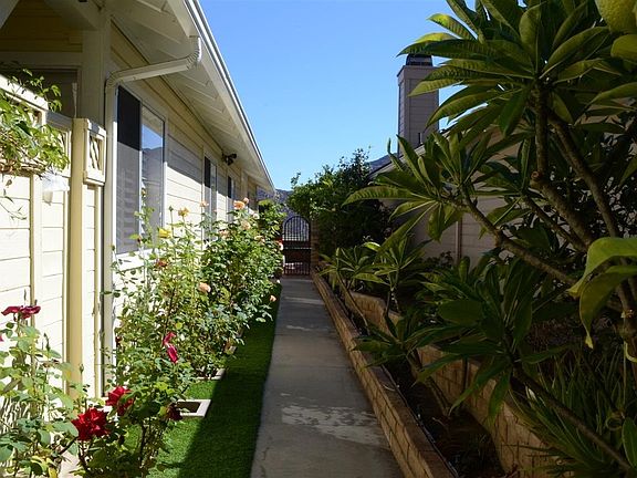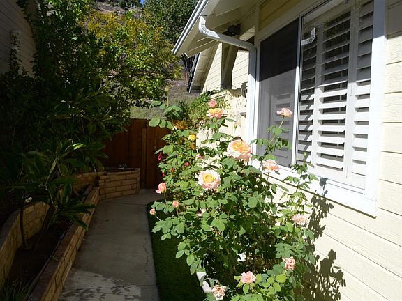 West Village SINGLE STORY on quiet St at the top! Largest single story in this gated community; Great mountain Views lovely Tropical garden walkway w/orange & lemon trees; Trex patio brick planters & wet bar; Vaulted ceilings fp ceiling fans; newer central a/c Handscraped laminate Plantation Shutters skylights; Silestone kit w/new cabinets side buffet & huge walk-in pantry 3rd br now a den but EZ 2 add door & closet. Mbr w/walk-in closet & lrg shower;2 car gar w/attic ladder & workbench.